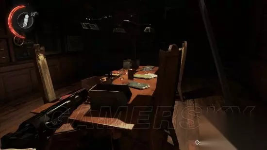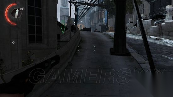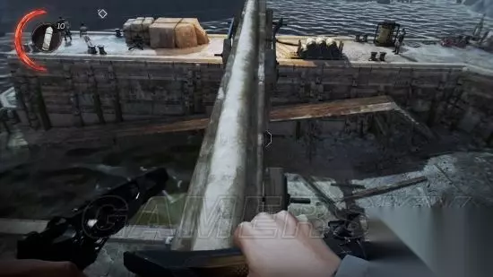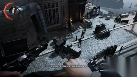 2:射击训练:进入小巷,桌子上有十字弓,切记,手枪会吵醒敌人,十字弓则不会发出声音。 按F拿到十字弓,桌子上面和旁边都有弩箭,按右键使用十字弓射击,击碎3个瓶子。 然后射击上方螺丝,重物就会落下击碎右侧木门。