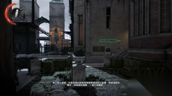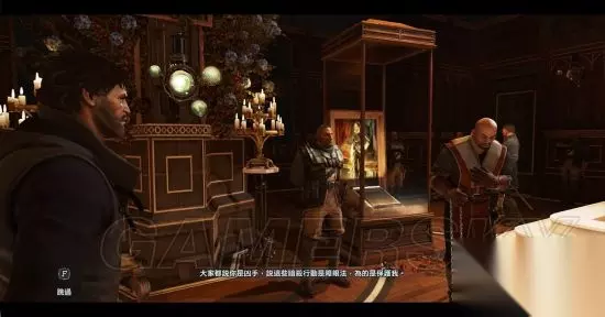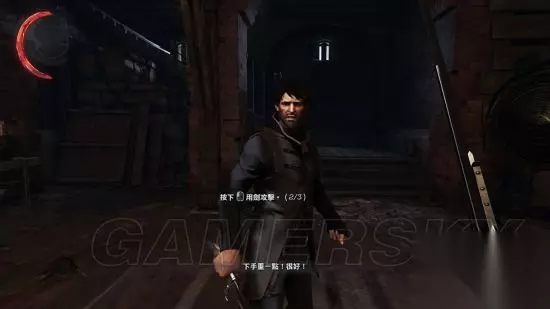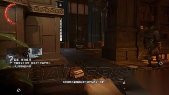 任务目标二:学习潜行暗杀,射击,战斗格挡技巧。 1:潜行训练:掐晕科尔沃。偷走科尔沃的钥匙。 潜行:在潜行模式下脚步无声,敌人侦测速度变慢,尤其当你距离他们较远,在敌人上方,或者在他慢眼角余光边缘。在潜行模式下,你可以把桌子当成掩体。 如果需要把敌人引开,可以投掷瓶子之类的物品或者设定时钟报时,分散敌人注意力 意识:敌人开始侦测到你的时候,上面会显示意识计量表,逐渐填满。白色意识计量表全满时,表示敌人会搜寻你。红色意识计量表全满时,表示你已经被侦测到了。(极难模式下,白色意识计量表到达一半时,敌人就开始怀疑调查) 掐晕科尔沃:按C潜行,走到科尔沃身后,按Ctrl键对其执行非致命狙击,完成掐晕科尔沃。