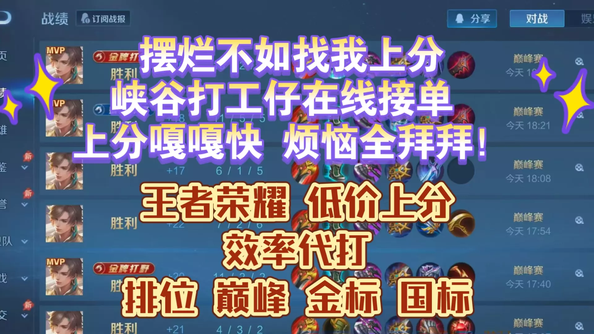 辅助 王者荣耀代练~星辰工作室家人们谁懂🤯峡谷上分瓶颈?一键解锁硬核代练,段位轻松拿捏,内卷对手不是梦!全网最宠粉代练上线~安全可靠、效率拉满、价格亲民
