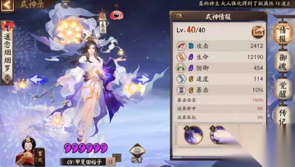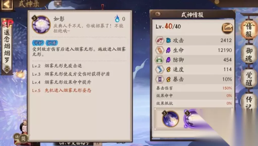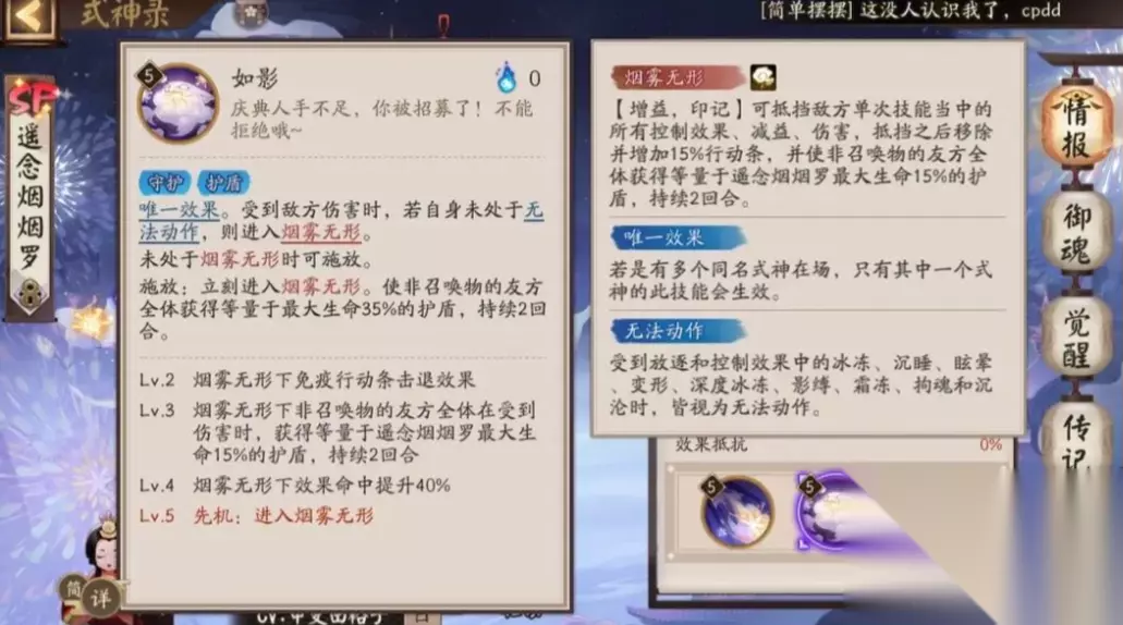 遥念烟烟罗从面板上只有暴击和速度是s级别的,但也只是基础的面板数值,作为一个sp品质的式神没有占到很大的优势。该式神的优势就是可以提供护盾和控制,是一个pvp占比比较大的式神。一技能普攻没有任何的特殊效果,就是增加一些自己的伤害而已,平时也用不到,也打不出多少伤害。二技能有被动和主动两个效果,被动时在自己受到伤害时,且自己的没有进行任何动作时,自己会进入一个烟雾无形的状态。这个状态下的烟烟罗会抵挡一次伤害、控制和减益,可以说自己处于一种无敌的状态,在抵挡一次后会退出这个状态,并给自己提高15%的行动条。