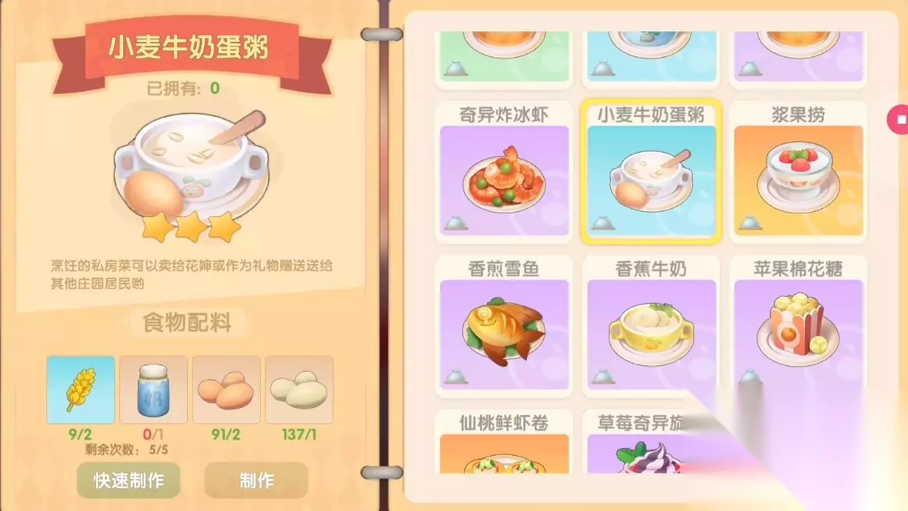 摩尔庄园小麦牛奶蛋粥怎么做呢?制作这个食物的话面粉和鸡蛋是最好的选择,那么摩尔庄园的小麦牛奶蛋粥是如何制作的?下面编辑为您提供摩尔庄园小麦牛奶蛋粥的制作方法,感兴趣就来看看吧。 摩尔庄园小麦牛奶蛋粥怎么做 食谱配方:小麦*2、牛奶*1、鸡蛋*2、鸭蛋*1 稀有度:3星