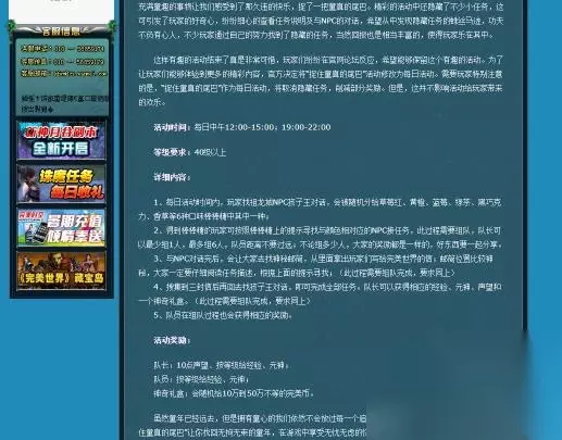 活动时间:每日中午12:00-15:00;19:00-22:00 等级要求:40级以上 详细内容: 1、每日活动时间内,玩家找祖龙城NPC孩子王对话,会被随机分给草莓红、黄橙、蓝莓、绿茶、黑巧克力、香草等6种口味棒棒糖中其中一种。 2、得到棒棒糖的玩家可按照棒棒糖上的提示寻找与颜色相对应的NPC接任务,此过程需要组队,队长可以最少组1人,最多组6人,队员距离不要过远;不论组多少人,大家的奖励都是一样的,好东西要一起分享。 3、与NPC对话完后,会让大家去找神秘邮筒,从里面拿出玩家们写给完美世界的信;邮筒位置比较神秘,大家一定要仔细阅读任务描述,根据上面的提示寻找(此过程需要组队完成,要求同上)。 4、搜集到三封信后再回去找孩子王对话,即可完成全部任务。队长可以获得相应的经验、元神、声望和一个神奇礼盒。(此过程需要组队完成,要求同上) 5、队员在组队过程也会获得相应的奖励。 活动奖励:队长:10点声望、按等级给经验、元神;队员:按等级给经验、元神;神奇礼盒:会随机给10万到50万不等的完美币。