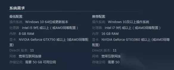 推荐配置: 操作系统: Windows 10及以上操作系统 处理器: Intel i7 9代 或以上(或AMD同等配置) 内存: 16 GB RAM 显卡: NVIDIA Geforce GTX1060 或以上 (或AMD同等配置) DirectX 版本: 11 网络: 宽带互联网连接 存储空间: 需要 50 GB 可用空间