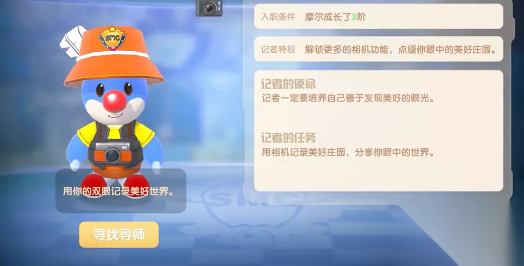 想手握新闻话筒,化身摩尔庄园的真相记录者?成为记者可是个超酷的选择!开启这份职业的钥匙,就藏在爱心教堂那位总带着故事眼神的 NPC 艾米那里。先麻利儿完成入职小任务提升点基础等级,接着直奔教堂找这位导师聊聊吧!她会严肃又亲切地给你普及记者的职业守则,然后抛出第一道考验任务:举起你的相机,在城堡特定角落完成一次专业拍摄。别担心,考验难度不高,更多是体验角色。咔嚓一声拍好,恭喜你!记者证立刻到手,还有专属的记者行头立刻上身 —— 这起步真的不难!