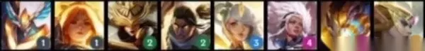 圣光卫士 [圣光卫士]获得额外护甲,魔抗,法强。当他们死亡时,会将这些额外的属性平分至存活的友方[圣光卫士]。(有点像暗星羁绊,不过还有双抗,更加厉害一些了。) 英雄:亚托克斯、蕾欧娜、辛德拉、韦鲁斯、拉克丝、芮尔、维克兹、凯尔