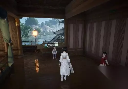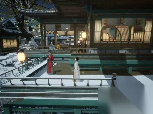7、前往长庆楼二楼长凳上触碰皓雪梅。 采摘一枝皓雪梅。