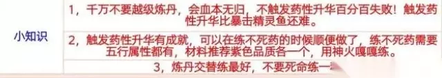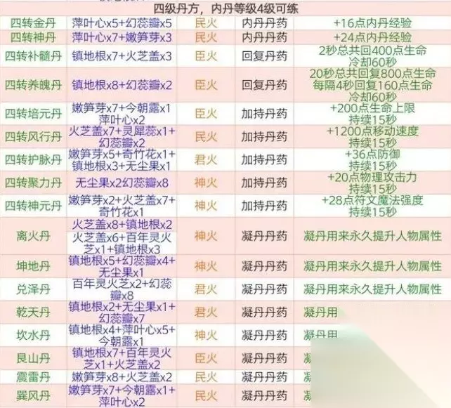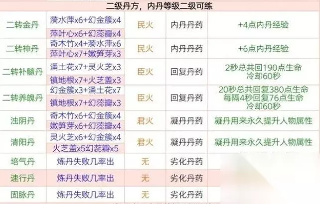 二、二级丹方(内丹等级二级可炼) 二转金丹=幻金簇x6+漪水萍x4+民火 二转神丹=奇木竹x6+漪水萍x4+民火 二转补髓丹=灵火芝x6+涌土花x4+臣火 二转养魄丹=幻金簇x6+涌土花x4+臣火 浊阴丹=奇木竹x6+幻金簇x4+君火 清阳丹=灵火芝x6+幻金簇x4+君火 培气丹:炼丹失败几率产出 速行丹:炼丹失败几率产出 固脉丹:炼丹失败几率产出