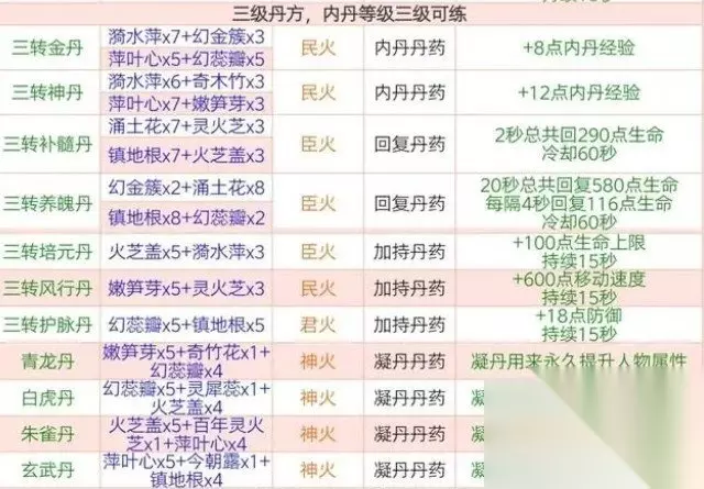 三、三级丹方(内丹等级三级可练) 三转金丹=中量水+微量金 三转神丹=中量水+少量木 三转补髓丹=中量土+微量火 三转养魄丹=中量土+少量金 三转培元丹=中量火+微量水 三转风行丹=中量木+微量火 三转护脉丹=微量土+中量金 青龙丹=中量木+少量金 白虎丹=中量金+少量火 朱雀丹=中量火+少量水 玄武丹=中量水+少量土