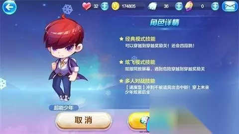 超能少年: 他那看似呆萌的外表和那双魅力四射的眼神,是不是已经吸引了你的注意?超能少年是一位具有穿越能力的角色,通过他的穿越技能,可以在游戏中为你的表现分加分。此外,他还能进行连跳,这在游戏中并不常见。在炫飞模式下,只需双手同时触碰屏幕以避开导弹等危险,他就能穿梭到穿越奖励关卡,保证你的安全。 未来少年这款皮肤是专属于超能少年的,它能够将超能少年的等级提升至130级,在经典玩法下,你将获得一个炫酷的高分头像,以及额外的得分加成。在多人模式下,金币也将转化为星星,而收集这些星星将为你带来额外的表现分。然而,这一切都只限于超能少年的使用。