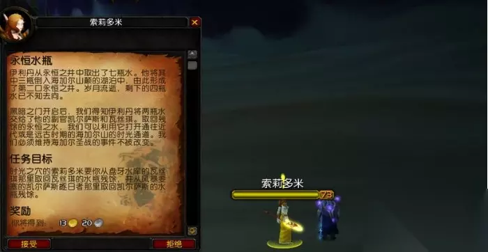 魔兽世界怀旧服海山任务流程攻略 流程如下: 1、首先在时光之穴里面找“索莉多米”接到《永恒水瓶》的任务。