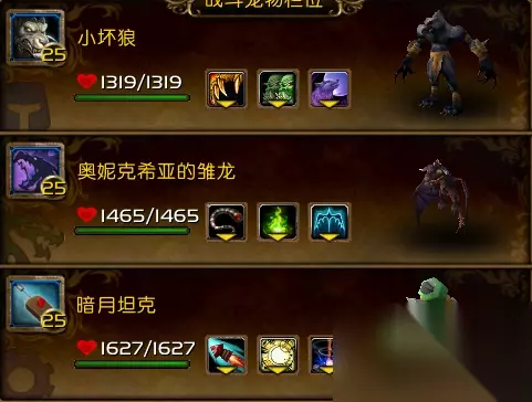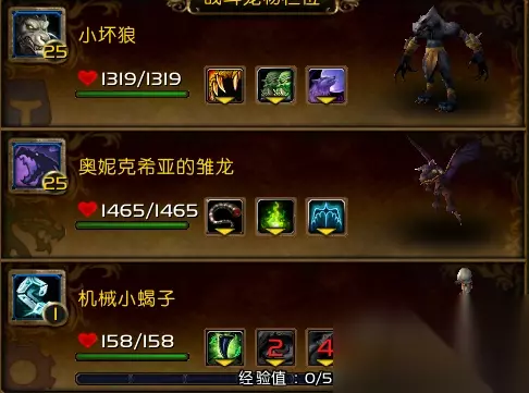 1.满速小坏狼,卡拉赞大灰狼掉落,315满速,技能:爪击,闪避,嚎叫 2.暗月坦克,暗月马戏团兑换,技能:飞弹,威慑,离子炮 3.奥妮克希亚幼龙,抓捕于奥妮克希亚的巢穴,技能:扫尾,愈体之焰,离地升空 打法:随意碾压,下面是可以用来练低级小宠物的组合,着重介绍!】 注:此组合除了练一级机械小宠物外,其他的都必须要求练级宠高于3级,或者血量大于300,否则会被两轮AOE后排秒杀,请仔细挑选! 可练一级小宠物推荐配置以及技能搭配: