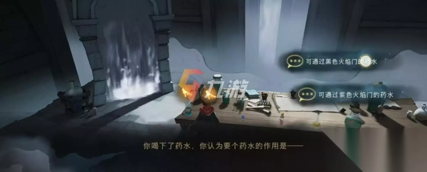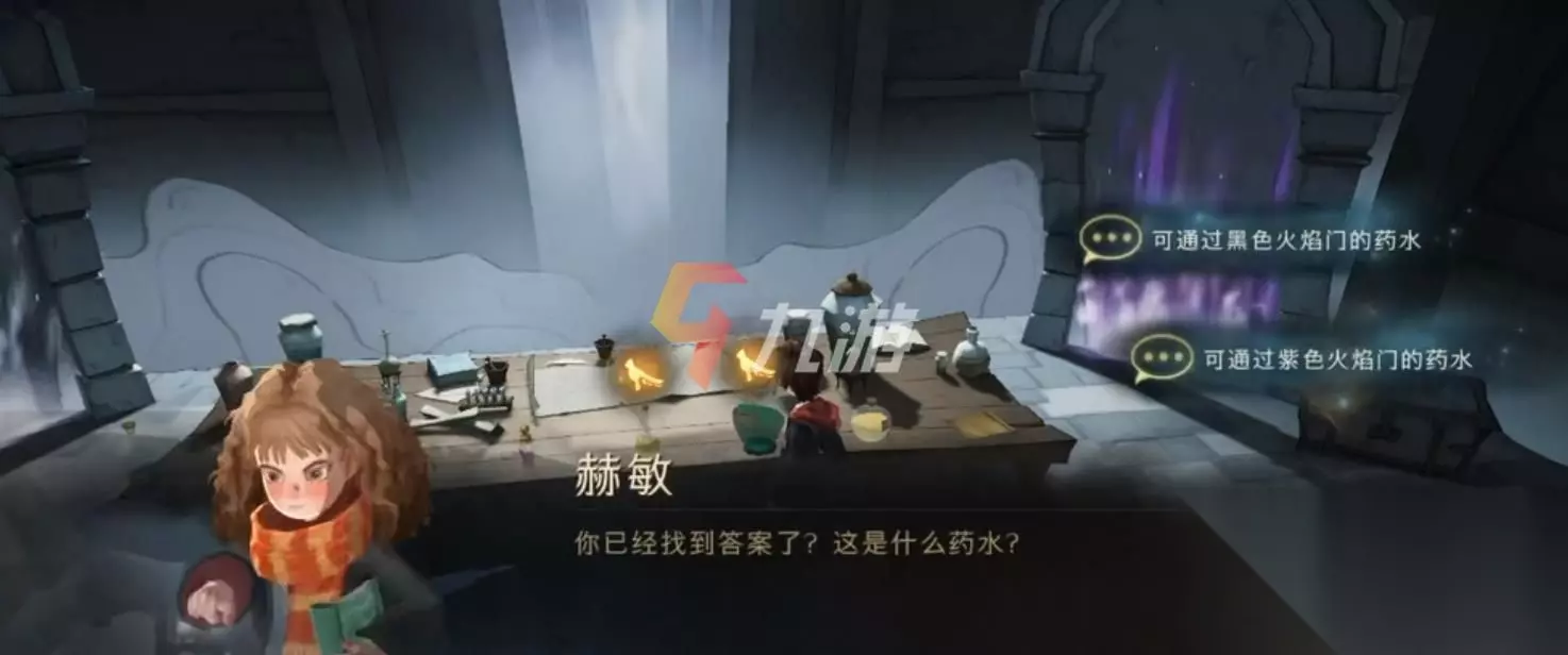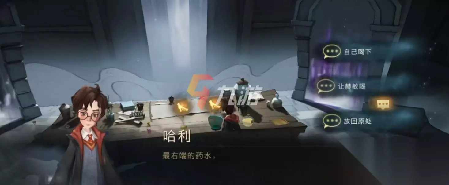 无名之书斯内普谜题攻略 这一关比较考验小伙伴们的推理能力,需要在7个瓶子里找出正确的药剂,同时还要选对通过的门,这7个瓶子里有三个是毒药、两个是荨麻酒,剩下的两个就是正确的是药剂了。 而想要满星通过这一关的话,正确的答案就是,小伙伴们先去和左右两侧的荨麻酒,然后让哈利去喝右一的黄色药剂,最后选择紫色火焰的门,就可以顺利完成这一关的谜题挑战了。