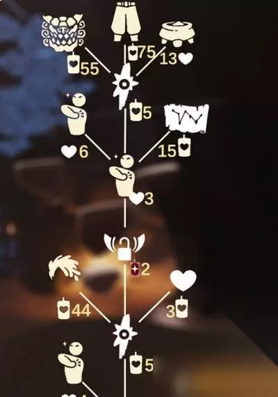 1,武士裤 :70蜡烛 2,粗脏辫: 44蜡烛 3,面具 55蜡烛 4,乐谱 :15蜡烛 5,前置魔法节点2个: 合计10蜡烛 6,一颗爱心 :3蜡烛 7,一个永久光之翼: 2根升华蜡烛 8,动作:13爱心 9,一个共享空间物品“火炉”:13爱心 合计:202蜡烛 26爱心 :2根升华蜡烛 以上蜡烛消费等数据都是来自之前的,这次返场也有可能会有一定的变化,请玩家们以实际的复刻情况为准。