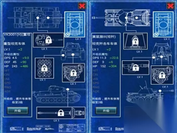可圈可点的科技树 作为一款战略游戏,《红警OL》针对每个阵营都设计了独有的科技树,通过图纸、碎片来升级每一个作战单位的能力数值(类似于RPG游戏中的装备强化),强化界面模仿了工业蓝图非常有设计感。不过被大量的数值所填充,玩起来有些头痛。