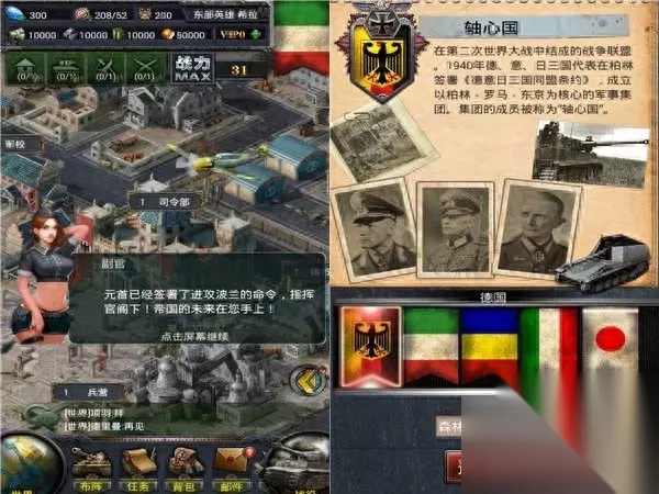 三分天下 还原二战历史 虽说叫《红警ol》但是与原作基本上没有任何关系,游戏套用二战背景,玩家可以在轴心国、盟军、共和国之间进行势力选择,抛去政治立场不说小编选择了看似高大上的轴心国,毕竟对于半个军控的人来说虎式坦克的魅力令人难以抵挡。PS:每个阵营都有各自独立的关卡设计和特有作战单位,在这点上可谓是极大的还原了二战的历史。