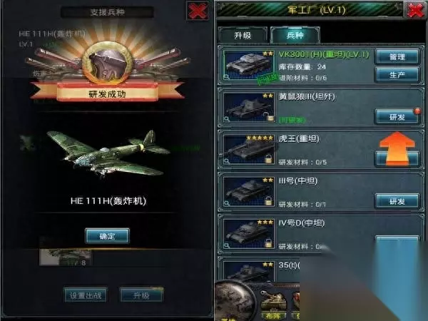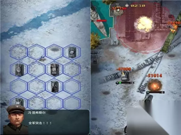 战斗方式 战斗方式相较于旧式手游有了些许进步,虽然依旧是上下卷轴式的场景,但是可出战的单位数量相当庞大,可以展现出集团军大规模作战的气势,玩家依旧不能对作战单位进行精细指向操作,但可以通过下方的支援按钮发动炮击、空袭来辅助进行战斗。这样的设计虽然降低了玩家的操作难度,但是却损失了战略游戏应有的策略性,眼看着被远程炮火点射却止步不前的AI也是令人有些醉了。