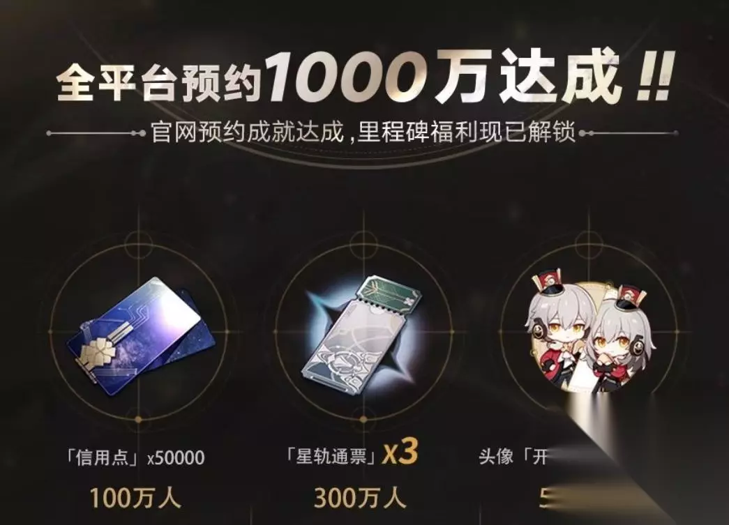 100万预约奖励是50000个单位的信用点,所谓的信用点就是游戏中的摩拉。 300万预约奖励是三张星轨通行证,这种通行证其实就是一种可以用来抽奖的道具,玩家利用星轨通行证可以抽到一些平时没法得到的稀有道具。 500万预约奖励是纪念性头像,玩家可以使用游戏提供的专属头像,每个玩家得到的头像都是独一无二的,绝对不会跟别的玩家撞型,当然,如果玩家不喜欢系统安排的头像,还可以进入DIY商店,自行设计自己的头像。 700万预约奖励是四星级别的雷法希露瓦,雷法希露瓦做过严格的测试和检验,拥有十分高强度的属性,他可以为玩家增加20%的武力属性,对玩家战斗有非常重要的作用,玩家作战时带上他,能够提高获胜的几率。 接下来就是最新的1000万预约奖励,奖励是15张星轨通行证,这还不算什么,真正吸引人的是15抽,什么意思呢,连续的15抽可以让玩家有80%的机会抽中手游中稀有度最高的四个角色之一,哪怕是剩下的20%,也可以得到十分丰厚的奖励。