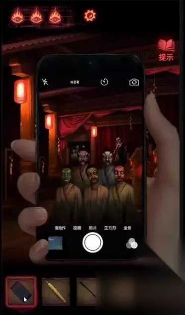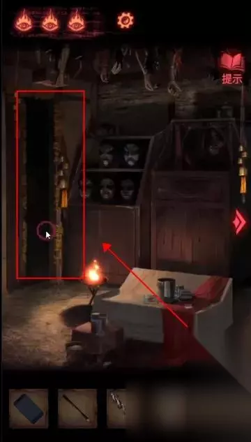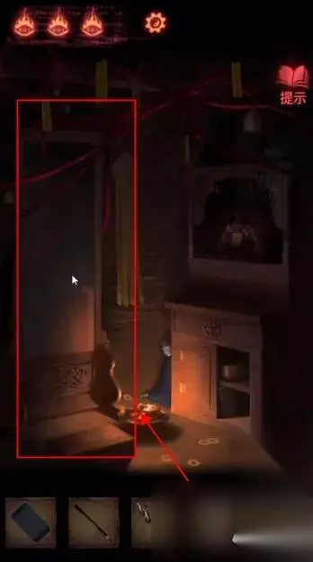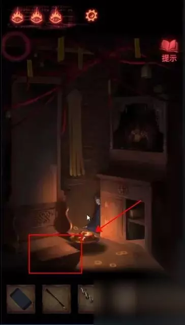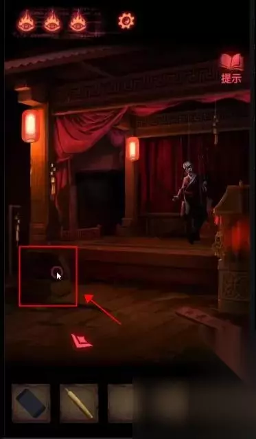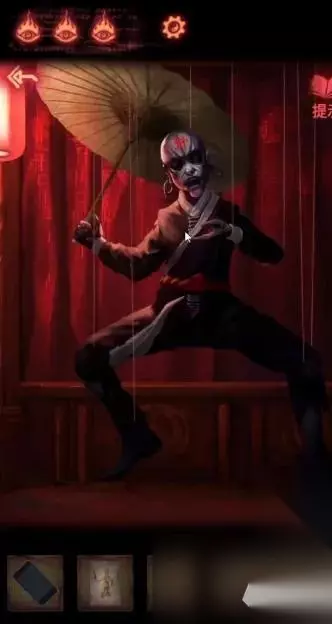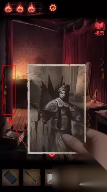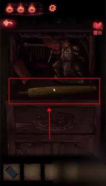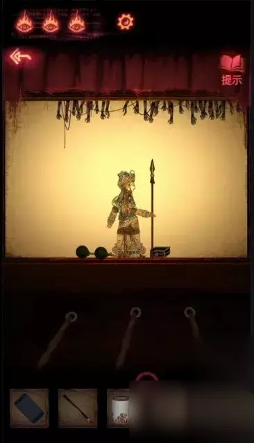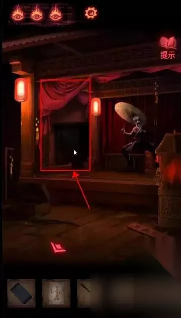 陶梦嫣逃出葬宫来到皮影楼。 点击右侧天王雕像柜子,获得【油伞】。