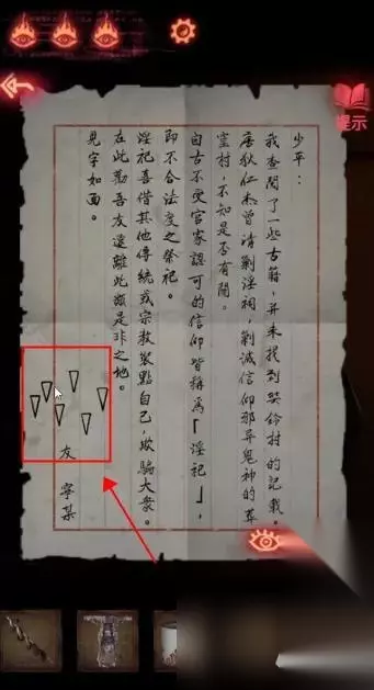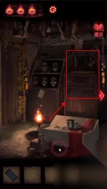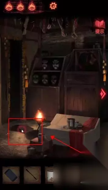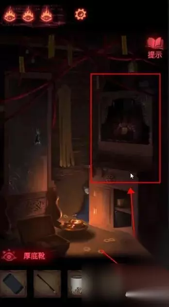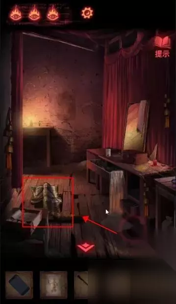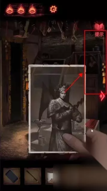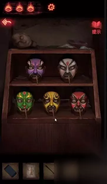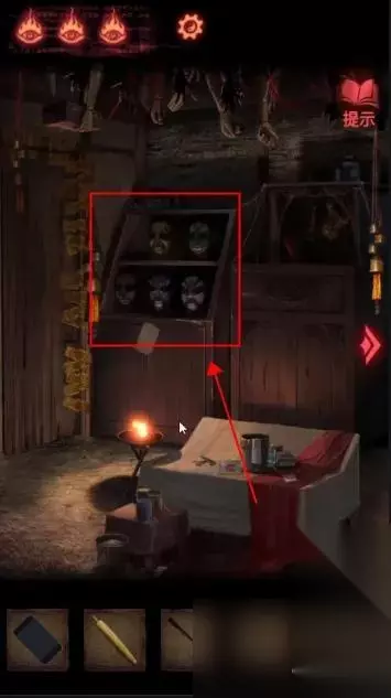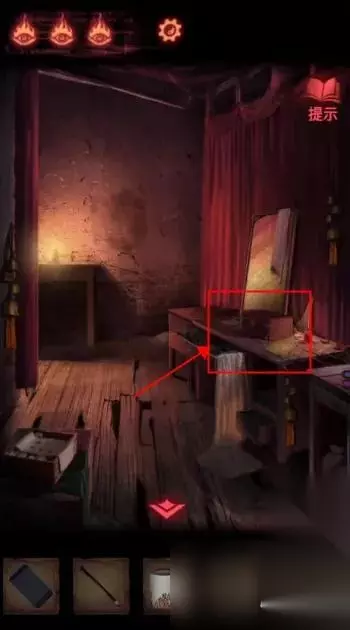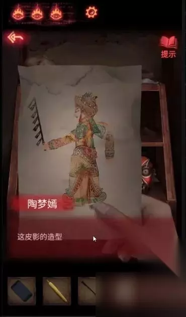 点击左下方首饰盒,获得【皮影的头】。 点击右侧镜子旁的瓶子,获得【空瓶】;点击镜子旁的笔记本,在末页看到画着方向箭头的笔迹。