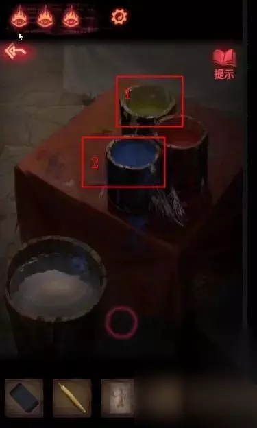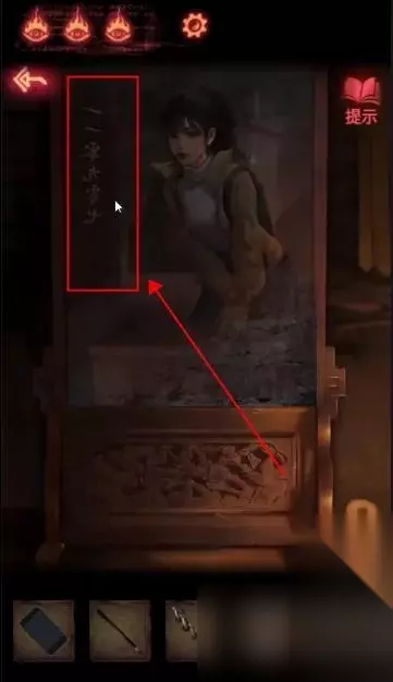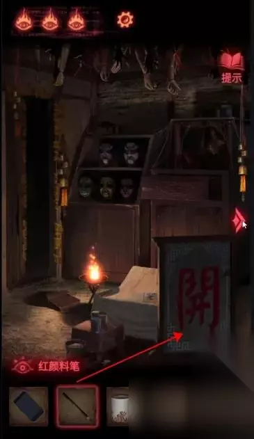 回到天王像房间,使用【卸妆水】点击关字,再使用【红颜料笔】,点击把关改成开。
