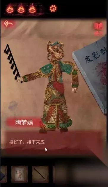 可以使用【卸妆水】把皮影人上涂错的颜色改正。根据纸上的图案拼接皮影。 使用【一组木杆】点击拼好的皮影人,获得【皮影】。