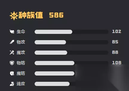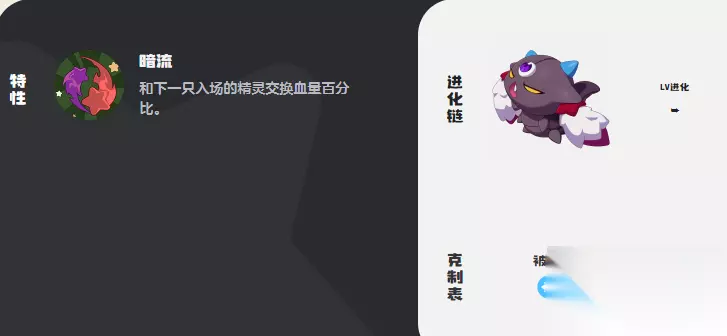 从种族数值来看,总共是586,有95速度,108物防,还有85物理攻击以及102生命,可以和下一只入场的精灵直接交换,血量百分比。进化链相对而言还是比较简单的,可以直接从瑰眼仔开始,逐步进化。在属性克制方面会被火系,还有光系克制,但是能有效抵抗草系,还有龙系。