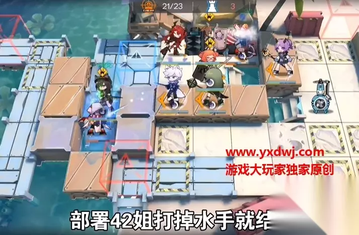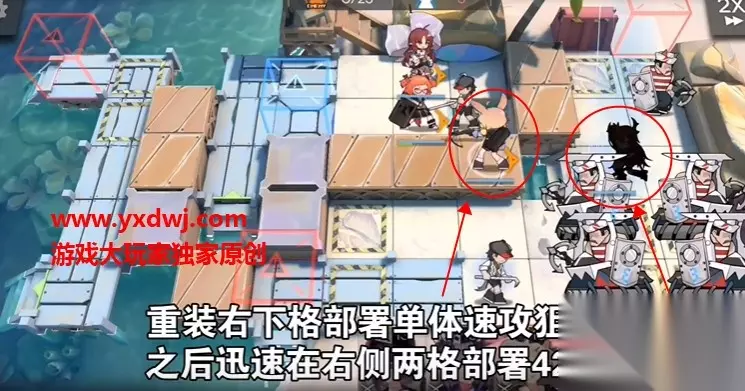 先桃金娘后低费T 第二步: 放置单体狙击朝右边 然后用史尔特尔开技能打掉左边两个摩托艇。