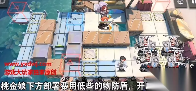 明日方舟dh-s-1低配阵容攻 第一步: 部署桃金娘开技能,然后在下面放置费用相对较低的物防盾抗怪。