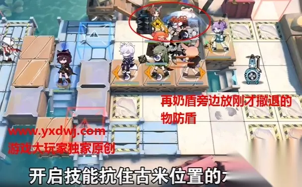 清第二批船,放第二个T 第六步: 之前放的物防盾被晕之后就撤回,然后换成奶盾。 在奶盾左边放上刚刚撤回的物防盾抗怪