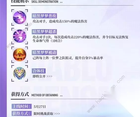 /暗黑梦梦/ “我和其他人不同,我没有梦想……我活着的唯一意义,是让梦之队的成员一直安全地生活下去。” 暗黑梦梦拥有绝对的魔法力量,所有伤害他和伙伴的人都将受到暗黑魔法的审判。 上线时间:5月27日 获得方式:限时挑战获取