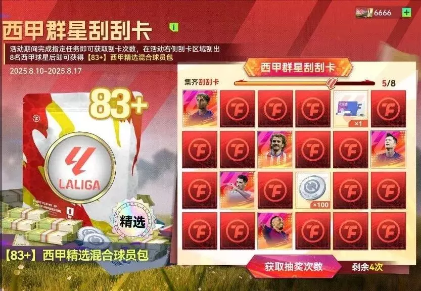 活动期间完成指定任务即可获取刮卡次数,在活动右侧刮卡区域刮出8名西甲球星后即可获得【83+】西甲精选混合球员包。