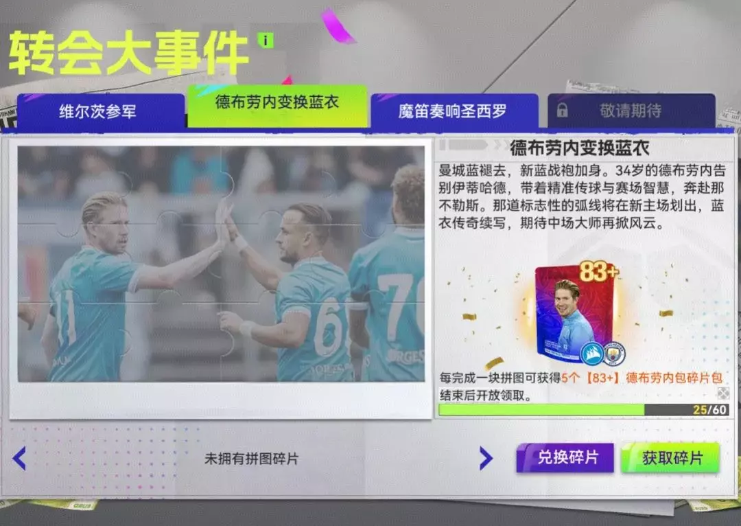 中场魔术师告别蓝月,传奇移步亚平宁!完成每日任务收集事件,完成转会大事件,即可赢取【83+】德布劳内概率up包等诸多好礼!