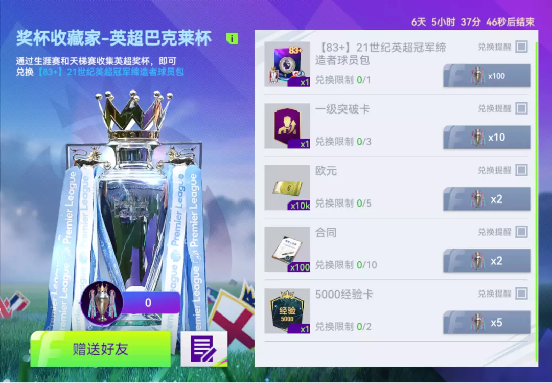 巴克莱杯是唯有王者方能举起的英格兰足坛璀璨桂冠。活动期间,完成生涯赛或天梯赛可掉落英超奖杯,收集奖杯可兑换【83+】21世纪英超冠军缔造者球员包。