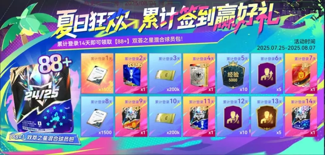 盛夏不止步,福利连番上!每日上线签到,豪礼等你来拿!累计登录14天即可获得【88+】双萃之星混合球员包奖励!本活动需要完成新秀专属签到后解锁。