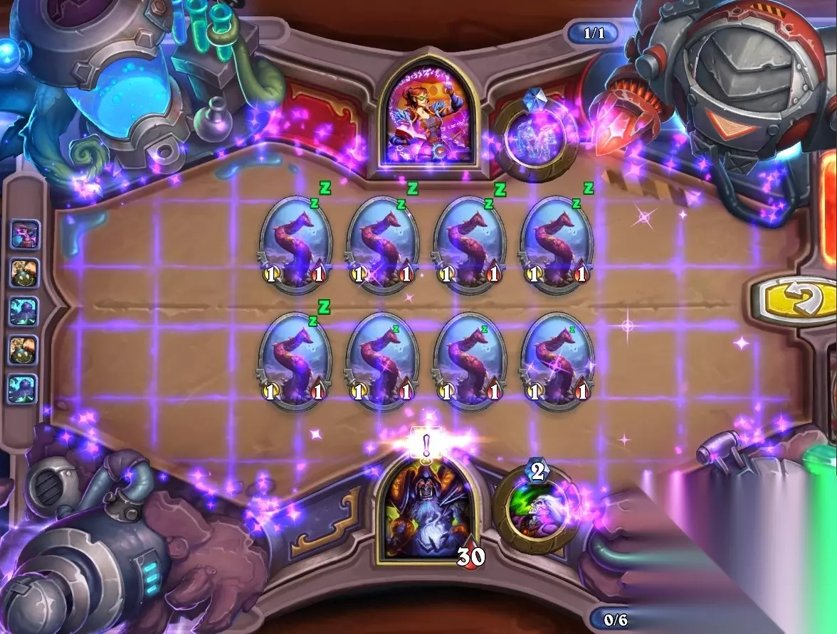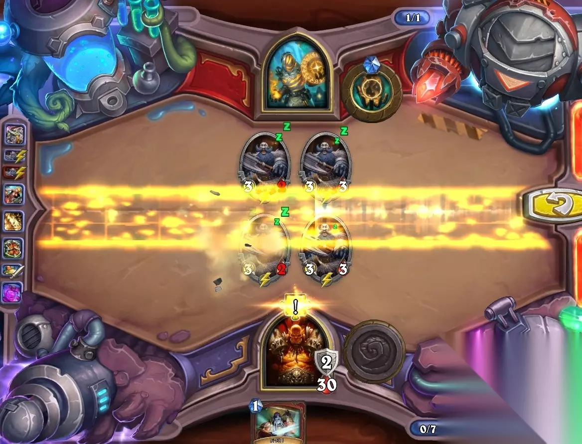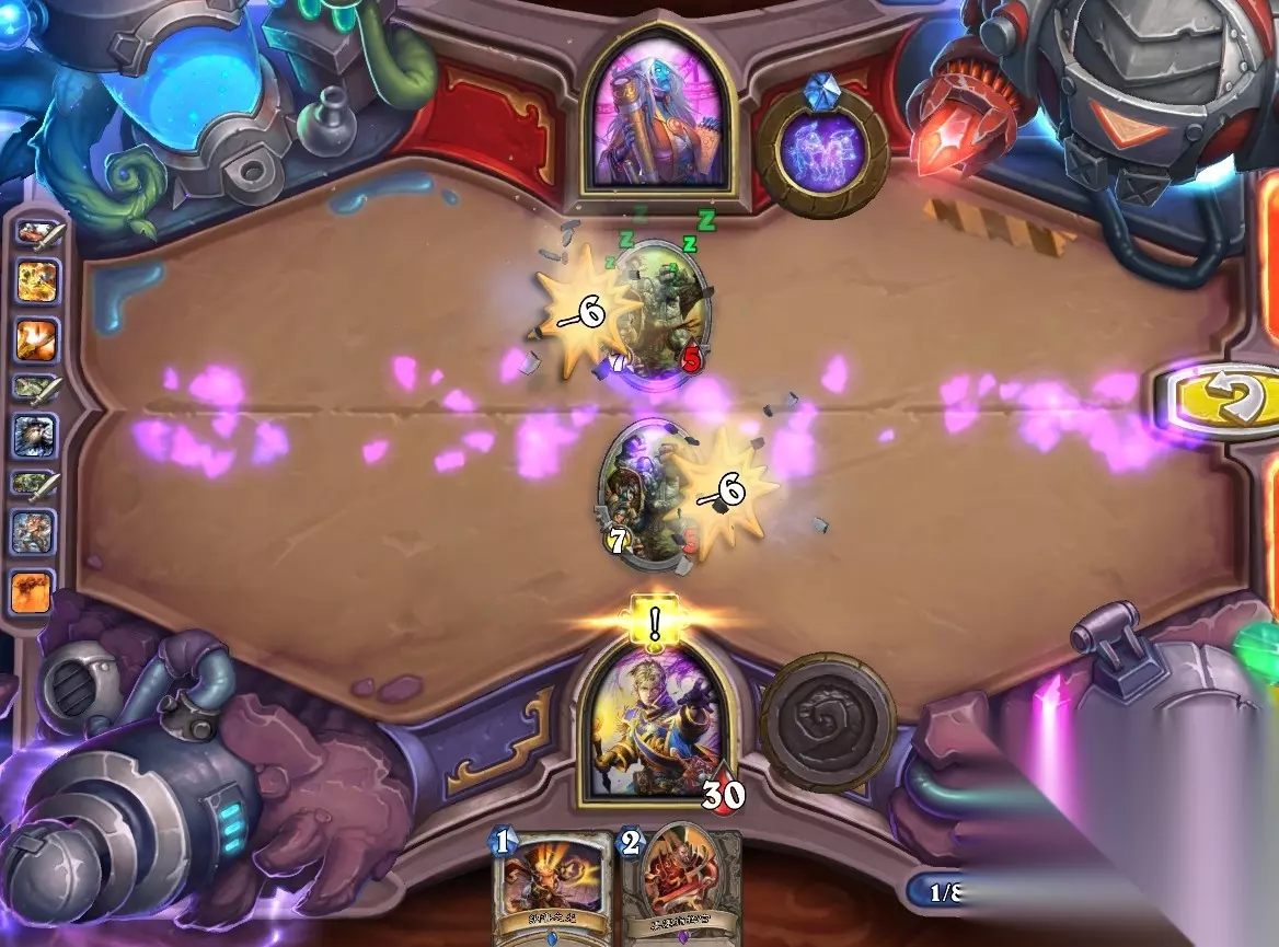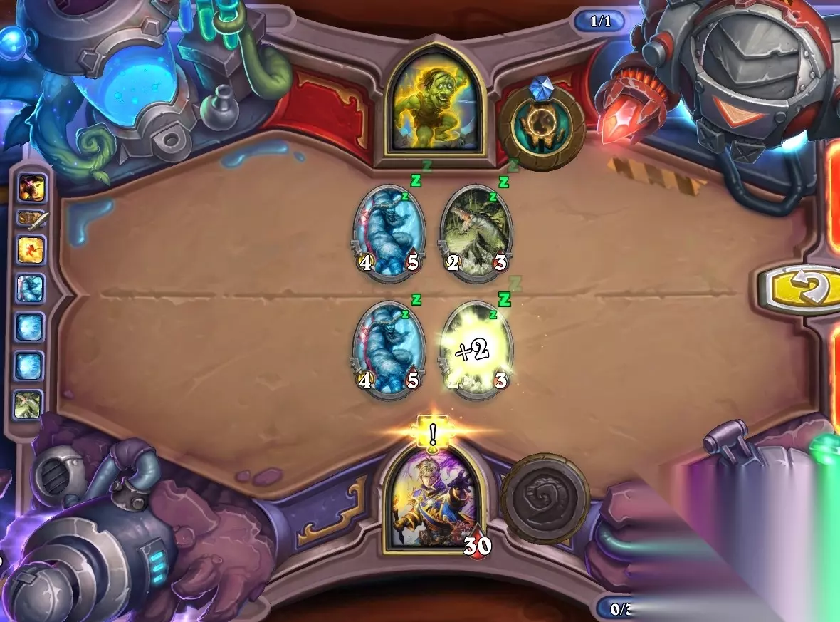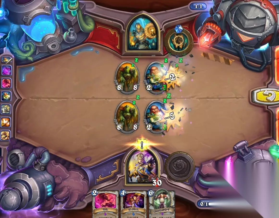 5、孵化器选择孵化脏鼠,旋风斩,脏鼠拉脏鼠,冲锋贴给活化狂战士后交换手牌,裸脏鼠,最后活化狂战士撞在满血脏鼠上。
