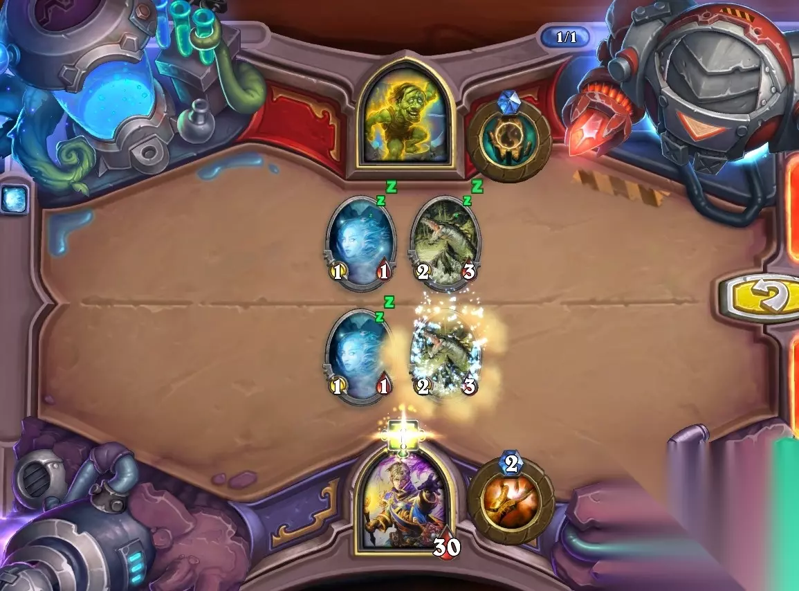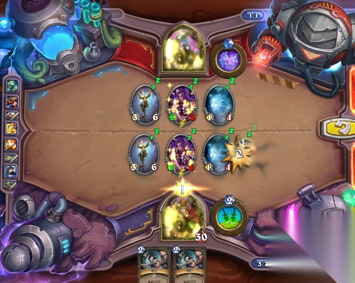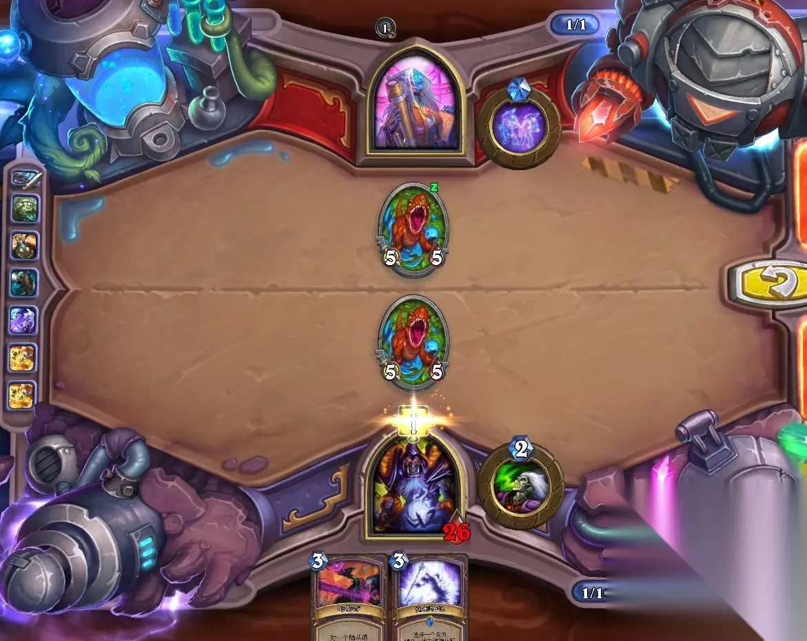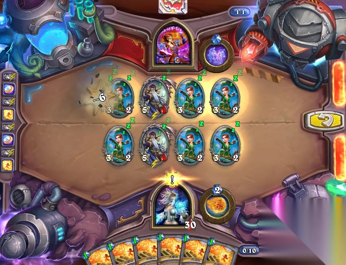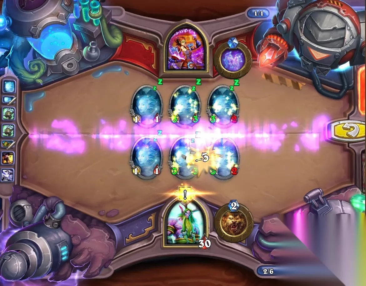 5、孵化器选择孵化脏鼠,旋风斩,脏鼠拉脏鼠,冲锋贴给活化狂战士后交换手牌,裸脏鼠,最后活化狂战士撞在满血脏鼠上。