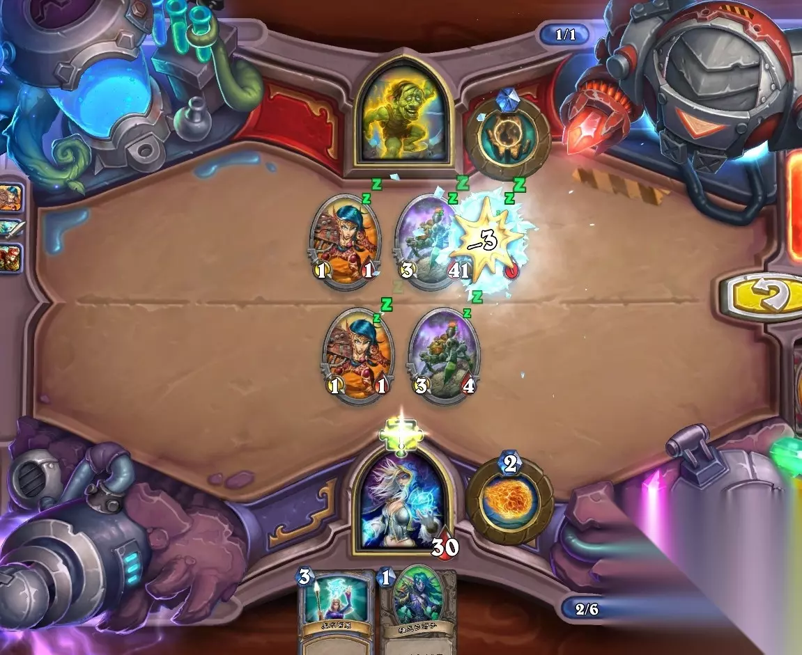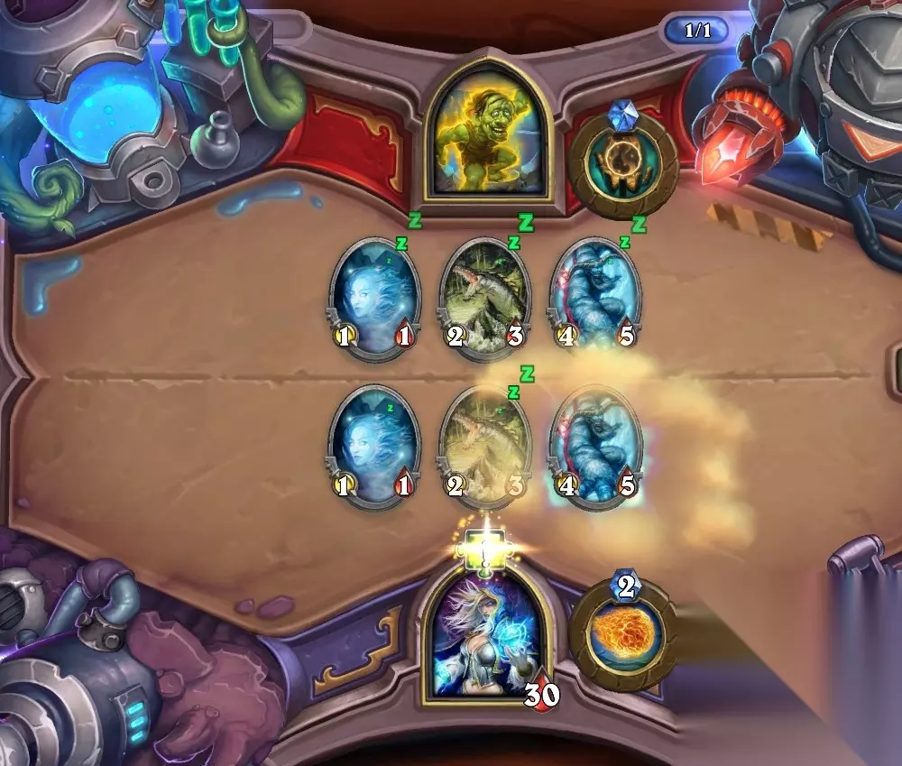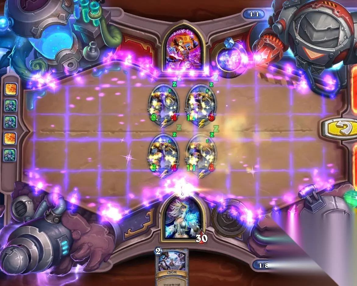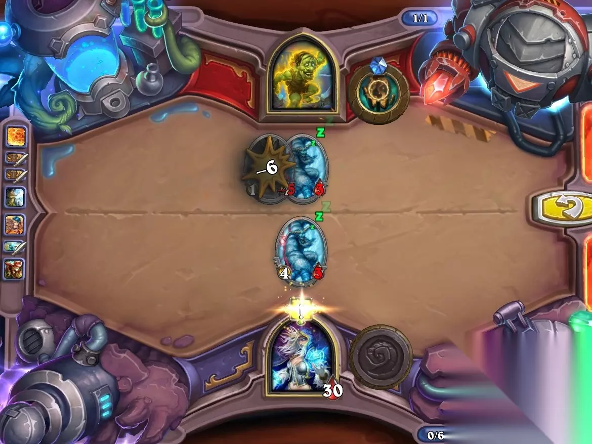 5、孵化器选择孵化脏鼠,旋风斩,脏鼠拉脏鼠,冲锋贴给活化狂战士后交换手牌,裸脏鼠,最后活化狂战士撞在满血脏鼠上。