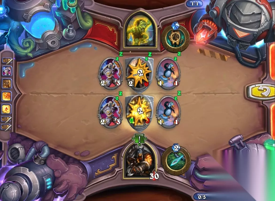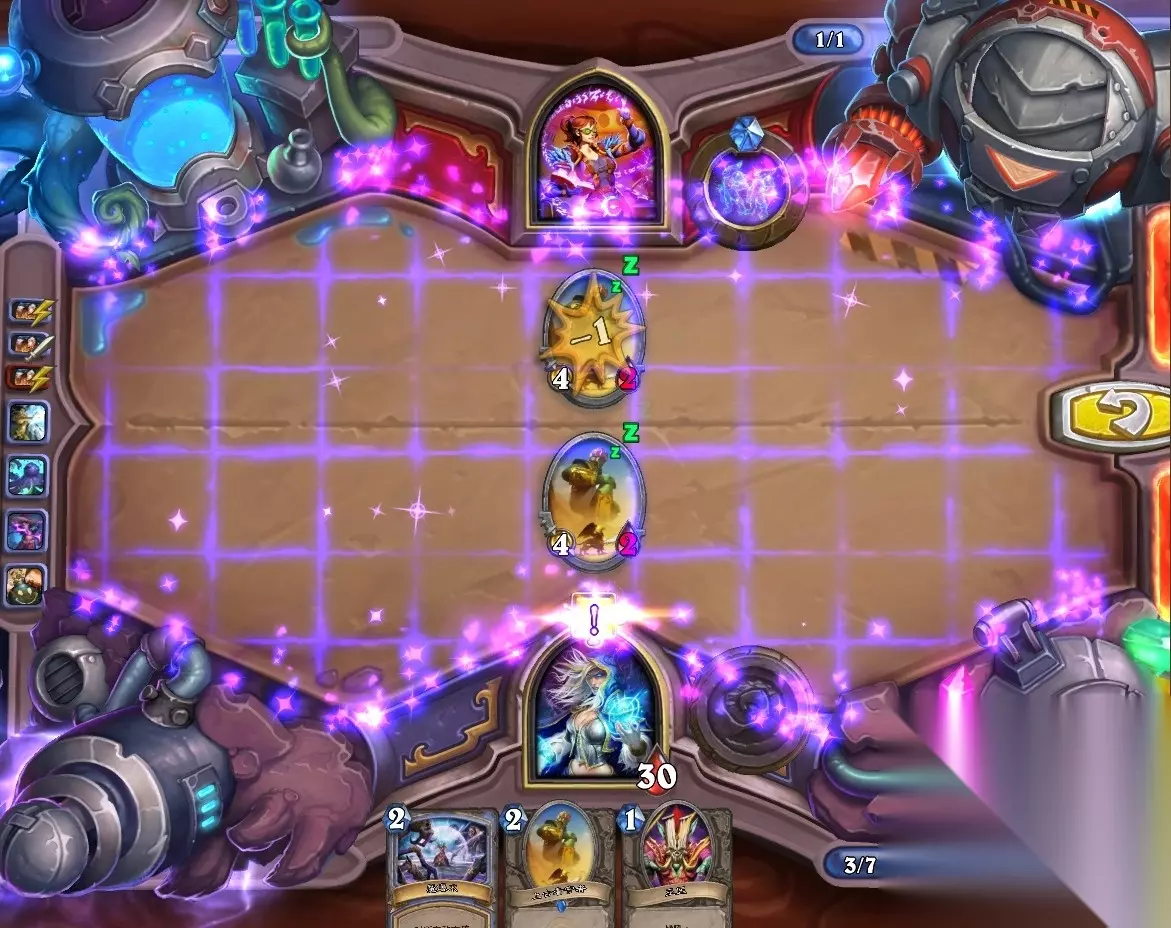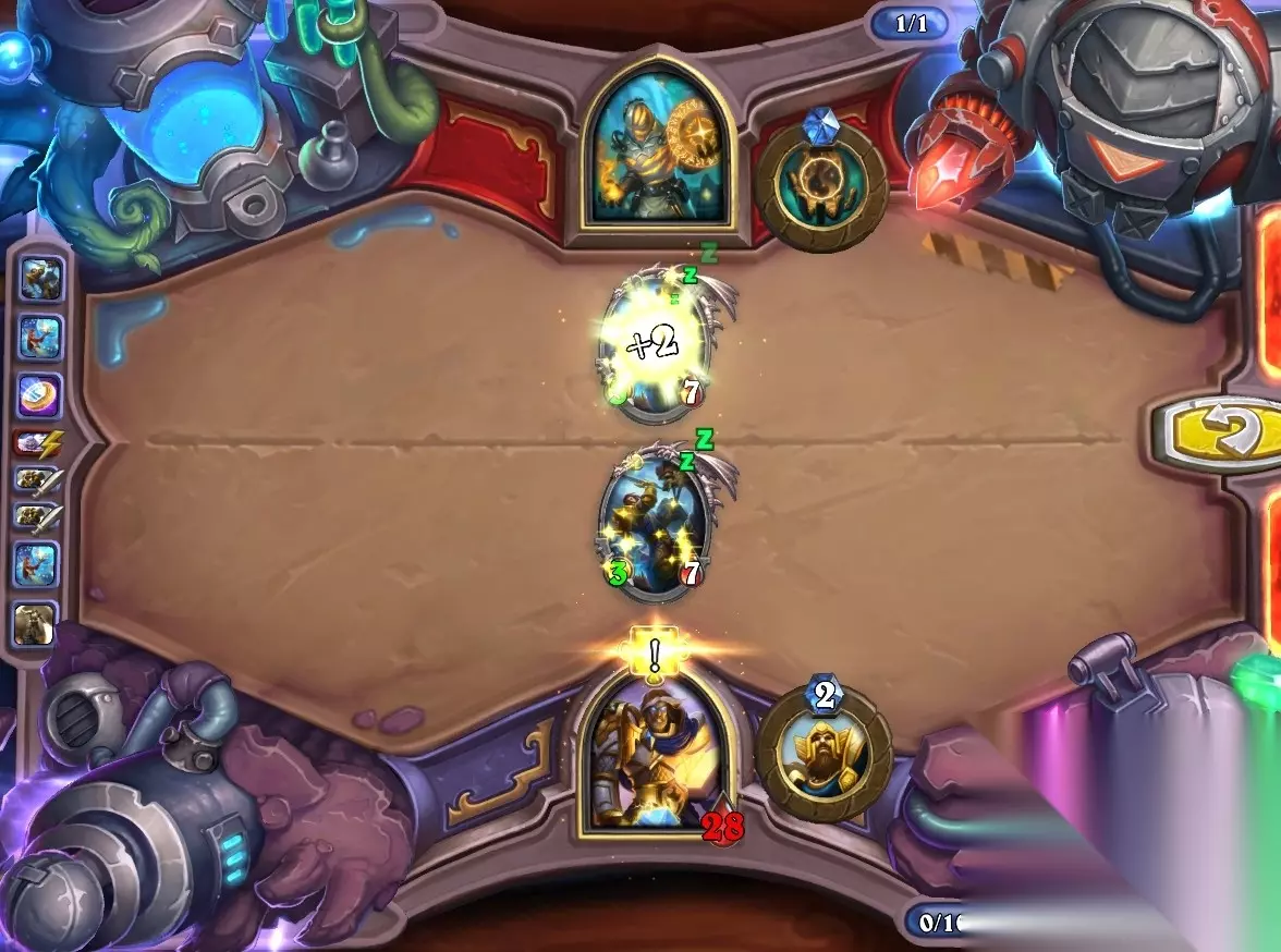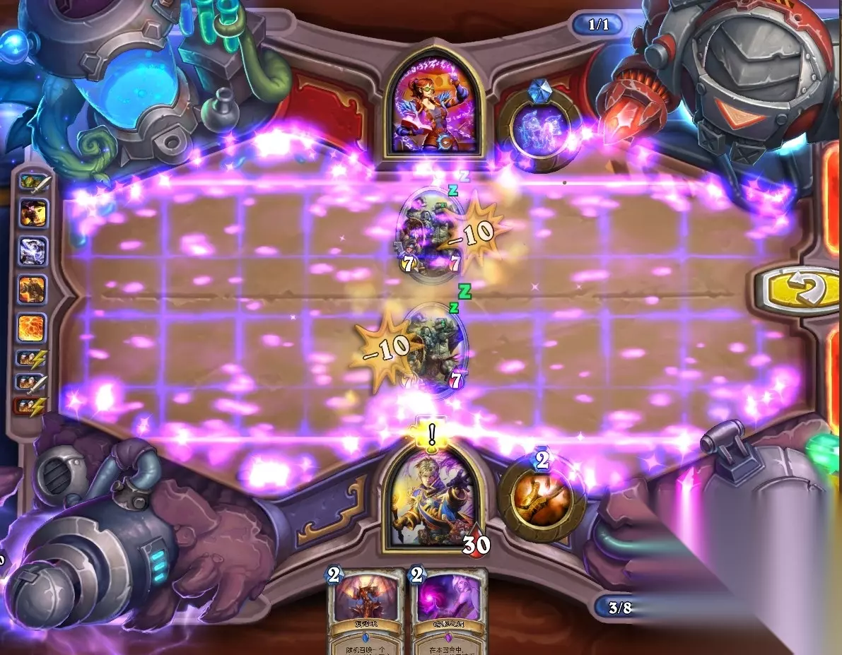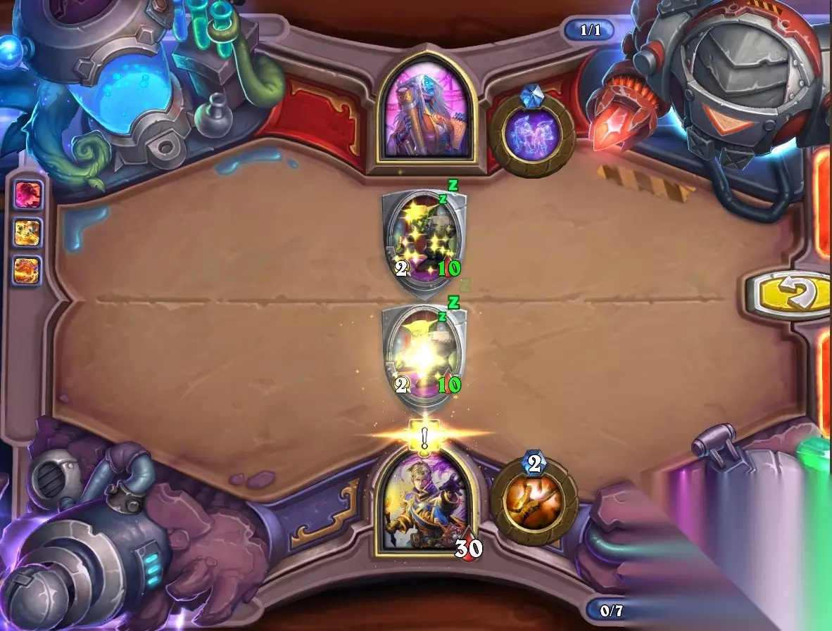 5、孵化器选择孵化脏鼠,旋风斩,脏鼠拉脏鼠,冲锋贴给活化狂战士后交换手牌,裸脏鼠,最后活化狂战士撞在满血脏鼠上。