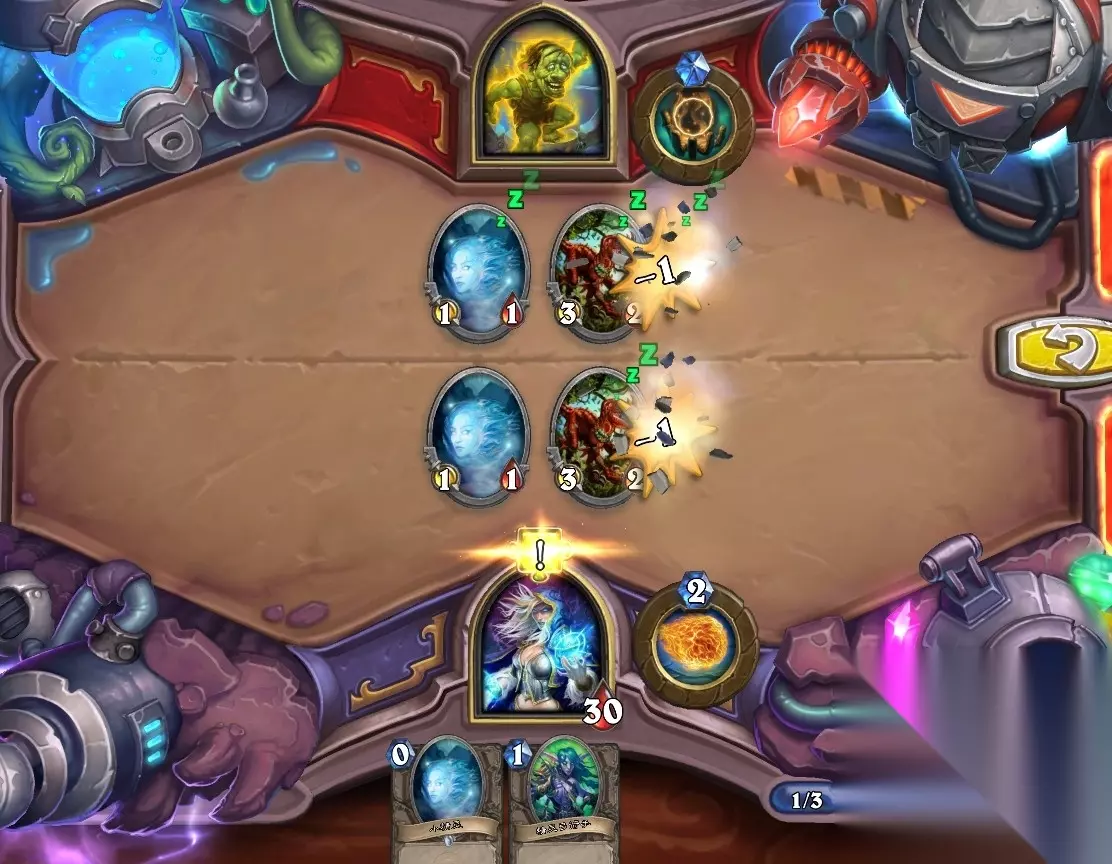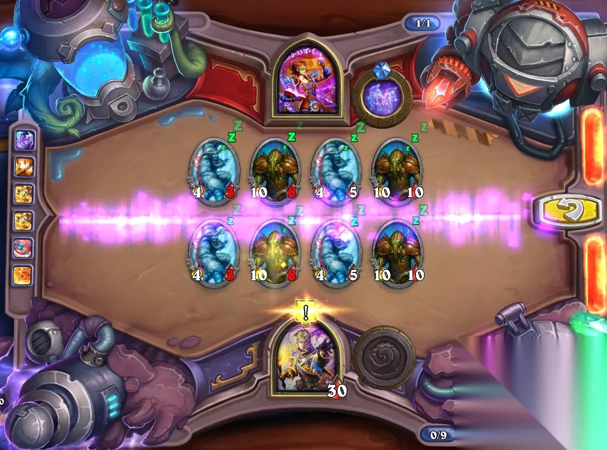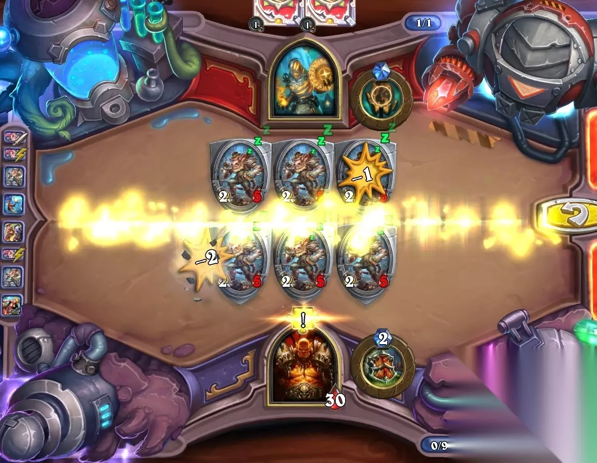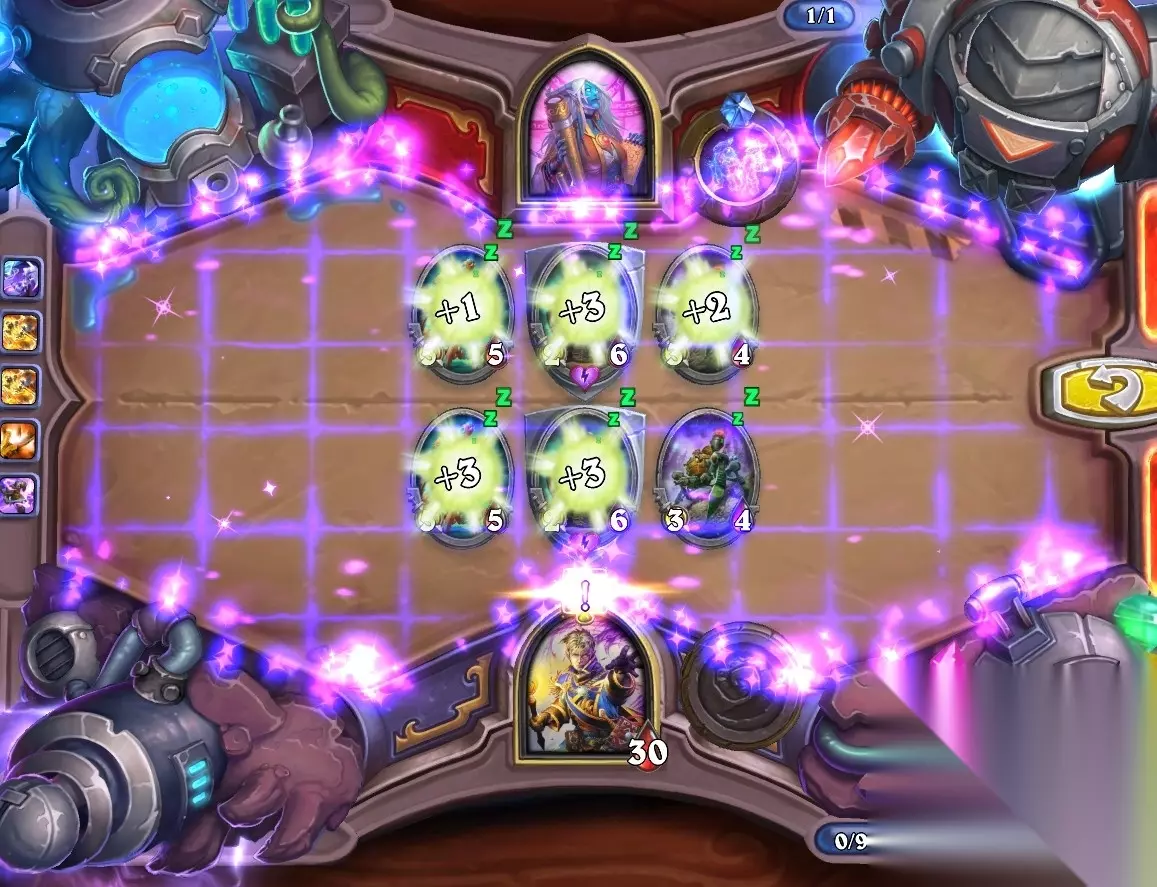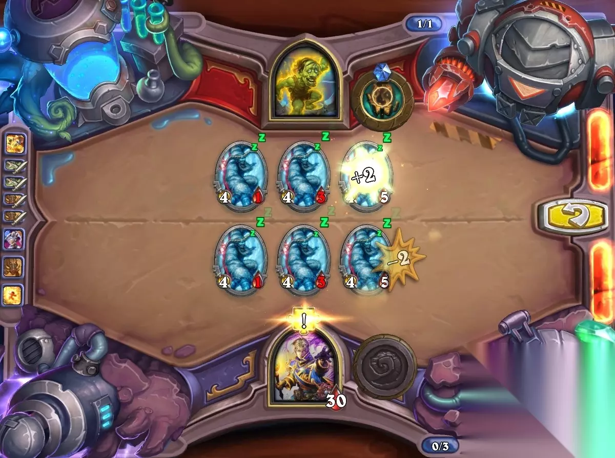 5、孵化器选择孵化脏鼠,旋风斩,脏鼠拉脏鼠,冲锋贴给活化狂战士后交换手牌,裸脏鼠,最后活化狂战士撞在满血脏鼠上。