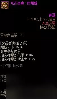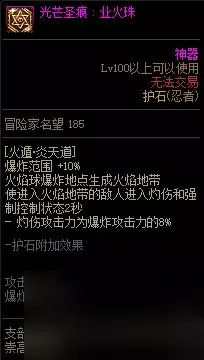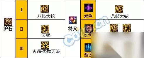 3.护石/符文 护石方面依然推荐:八岐大蛇+天照+炎舞天璇,由于小六道玩法出现,可以考虑炎舞护石替换为蟾蜍油炎弹,但是得考虑炎舞离开护石之后的范围小问题;“增加技能范围”词条仅适用炎舞的最终爆炸,输出仅占炎舞整体的一半,因此不替换护石也想玩小六道的话,可以调整符文或者使用巴卡尔武器贴膜词条“减少35-40技能15%cd”没有护石的炎舞形态对于忍者,就如改版前的不动明王阵对于阿修罗。 符文方面选择:紫色八岐大蛇*3,红色八岐大蛇*2,天照*1,蓝色八岐大蛇*1,风魔手里剑*2 如果考虑玩小六道但是不选择武器贴膜词条也不选择更换护石,可以考虑将1红1蓝的大蛇替换成绿色和蓝色的蟾蜍。