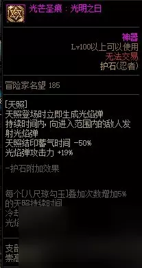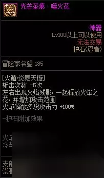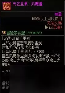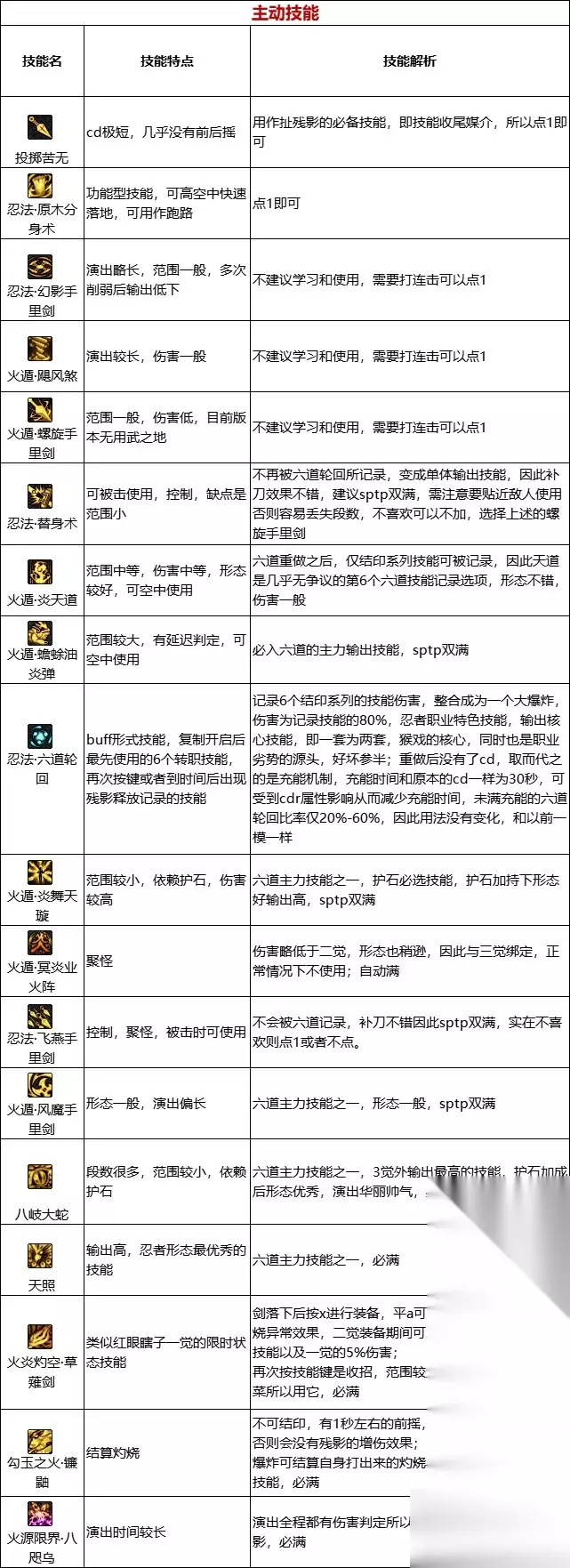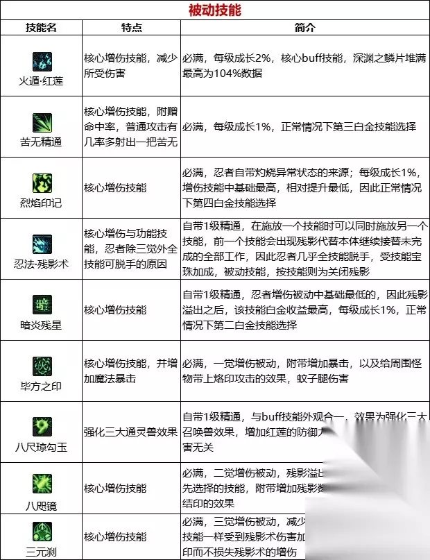 【护石提升率】 伤害提升率25% 【护石解析】 和青蛙类似,提升不错,新版本加强了2.8%,但是本身不太依赖护石,主要是给炎舞让位,一整套爆发时,使用风魔比炎舞仅高1%。极限打桩爱好者可以佩戴,通常不考虑。 经验之谈 1、六道技能选择: 当前版本进入六道的6个主力技能没有争议为:鸟,蛇,风魔,炎舞,青蛙,天道,因为新版本六道可记录技能仅限结印系列的,这6个技能之外只剩下范围小伤害低的小技能。完全不考虑; 一轮主力基本是同时脱手出去的,所以技能谁先谁后不会产生很大的影响,可以根据技能演出时间排序,一般最墨迹的风魔,鸟,蛇,炎舞,放前边。 2、扯残影: 残影术是全职业独一无二的技能,忍者在使用技能时(包括蓄力结印阶段),可以使用其他技能; 在游戏中可以看到,忍者放一个技能时,其他技能都是亮的,当我们在使用的技能还未结印完毕或者演出完毕时你按下一个技能,前一个没放完的技能将出现一个残影代替我们本体继续放完,包括结印,演出的全阶段,这个就叫扯残影; 技能需要扯出残影吃到残影的增伤,所以增伤的技能是上一个,后一个是媒介,与传统柔化增伤职业的原理相反; 因此忍者丢技能收尾需要带一个小苦无(投掷苦无),几乎没有前后摇且cd短,使用起来无限制,也可以使用上挑,暗魂波等等任意不重要的小技能; 比如六道一套爆发就是: 风魔+鸟+蛇+炎舞+青蛙+天道+小苦无收尾,中间穿插别的技能也可以,反正收尾配一个小苦无就行,就是为了让最后一个主力技能也有对应的收尾媒介,前边的主力技能都是自身充当了自己上一个技能的媒介,比如鸟就是风魔的媒介; 单个技能扯残影举例: 幻影手里剑+小苦无(投掷苦无),小苦无就是一个收尾用的技能,使幻影手里剑扯出残影代替本体施放的媒介,幻影手里剑也就吃到了残影术的增伤; 四个字精简概括: “快速连贯”这是核心 一者快速,二者技能按键要连贯,不是单独的按,单独按的话部分技能由于前摇很短,很有可能没有扯出残影而是本体释放了,新人刚开始玩的话,把握住重点:“快”即可; 不要说手残不会扯残影,不会扯残影绝对不是手残,也不是手速跟不上,用电脑打一句话按的键,随便都比忍者一套主力7个键要多的多,一套连招扯残影你依照顺序咣咣咣的一按就ok了。 3、技能连招: 灼烧流的“打桩”一整套爆发顺序是: 提前:开buff和六道,装备二觉,输出开始:解放二觉-六道6主力-解放六道-三觉-镰鼬,主要是结算三觉的灼烧,让其完整地吃到宠物技能,但是宠物只有10s的持续,所以这个手法会有一定的难度,可能需要一定的偷跑,或者适当的晚一点点开宠物技能; 灼烧流的“实战”一整套爆发顺序是: 提前:开buff和六道,装备二觉,输出开始:解放二觉-六道6主力-解放六道-镰鼬结算-三觉,实战推荐使用镰鼬结算本体和六道的输出,三觉放养,如果可以做到镰鼬爆炸在宠物技能结束前,仍可以使用打桩顺序; 其他流派由于不需要镰鼬的结算功能,因此使用时机和技能顺序和旧版本没区别: 提前:开buff和六道,装备二觉,输出开始:解放二觉-六道6主力+镰鼬一起扯残影-解放六道-三觉。 10秒内全技能演出完毕(吃满宠物技能)为忍者打桩手法入门完成。 4、结印相关: 快速,连贯地按键,残影就是自动满印的,所以不要纠结于结印重不重要,残影反正会结满印的; 三觉后新增一个属性,可结印的技能手动结印至满也能吃到残影术的增伤效果,并非一定要扯残影,所以有时候不想扯残影或者处于不适合扯残影的场合,就长按技能结印(蓄力)至满; 但是能用到的机会不多,因为小苦无不会被六道记录,就算是大招分开单独用,依然可以扯一个小苦无脱手,残影不够用的时候可以长按省影子,现版本长按满印速度也很快。 5、其他: 忍者不要使用一键连招,百害而无一利,会玩的根本不需要,只要熟悉自己的键位,不看屏幕都可以打一套连招; 不会玩忍者依赖一键连招那更是不可取,扯残影并不耗时耗力,手动扯一套正常都是在1-2秒左右,使用一键连招也不会让忍者变简单; 忍者难点从来不在扯残影而是技能机动性差,实战需要被动得配合副本和怪物机制找输出时机,不能随意放大否则一空空全部。