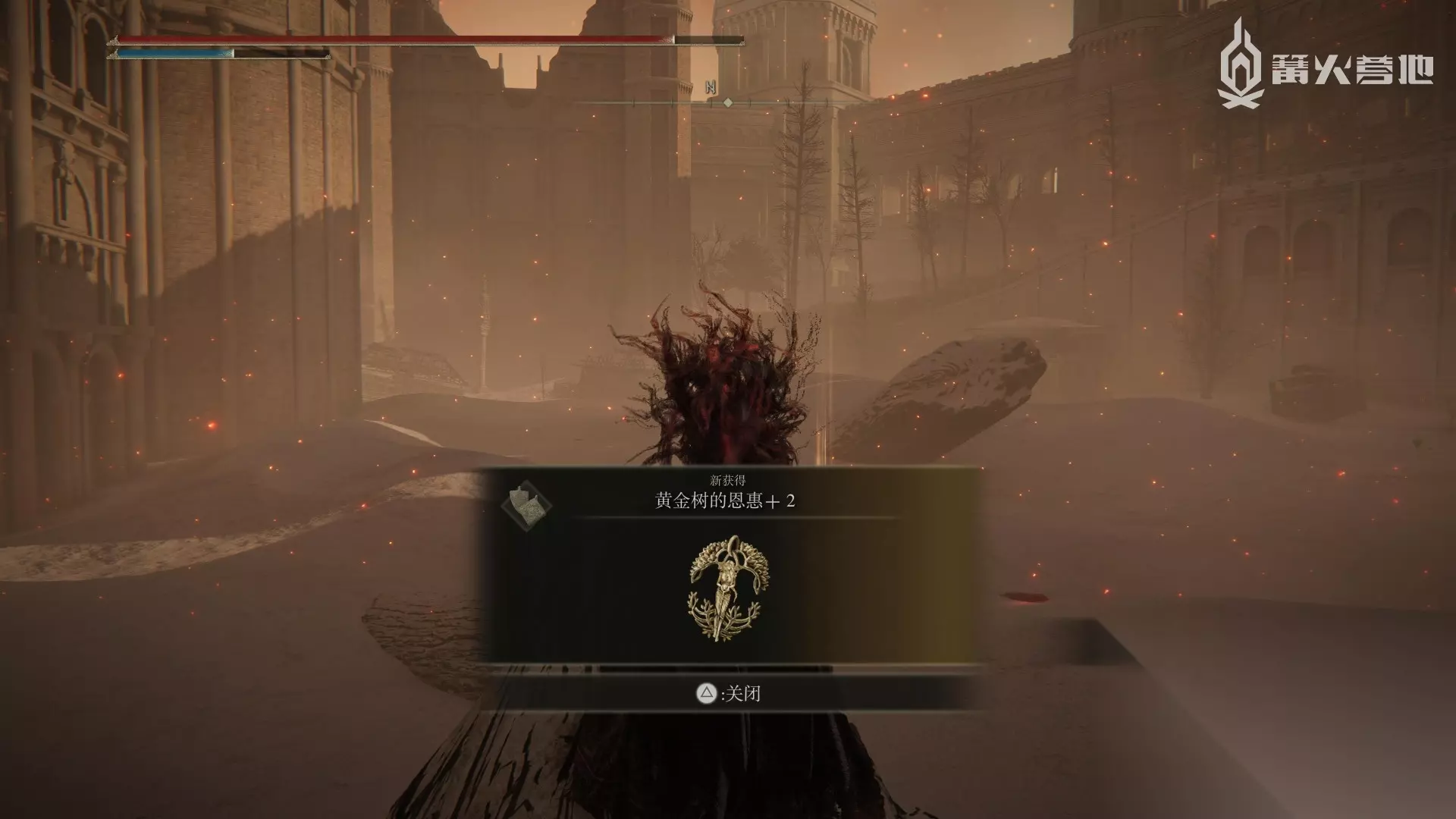黄金树的恩惠 +2 击败逐渐崩毁的法姆·亚兹拉的 Boss「野兽祭司」,王城变为灰烬王城,从赐福「禁域」回头坐升降梯,往回到王城的方向走,会看到地面上出现了两只腐烂树灵(击杀后还会出来一只),附近突出的柱子上可以拾得此护符。