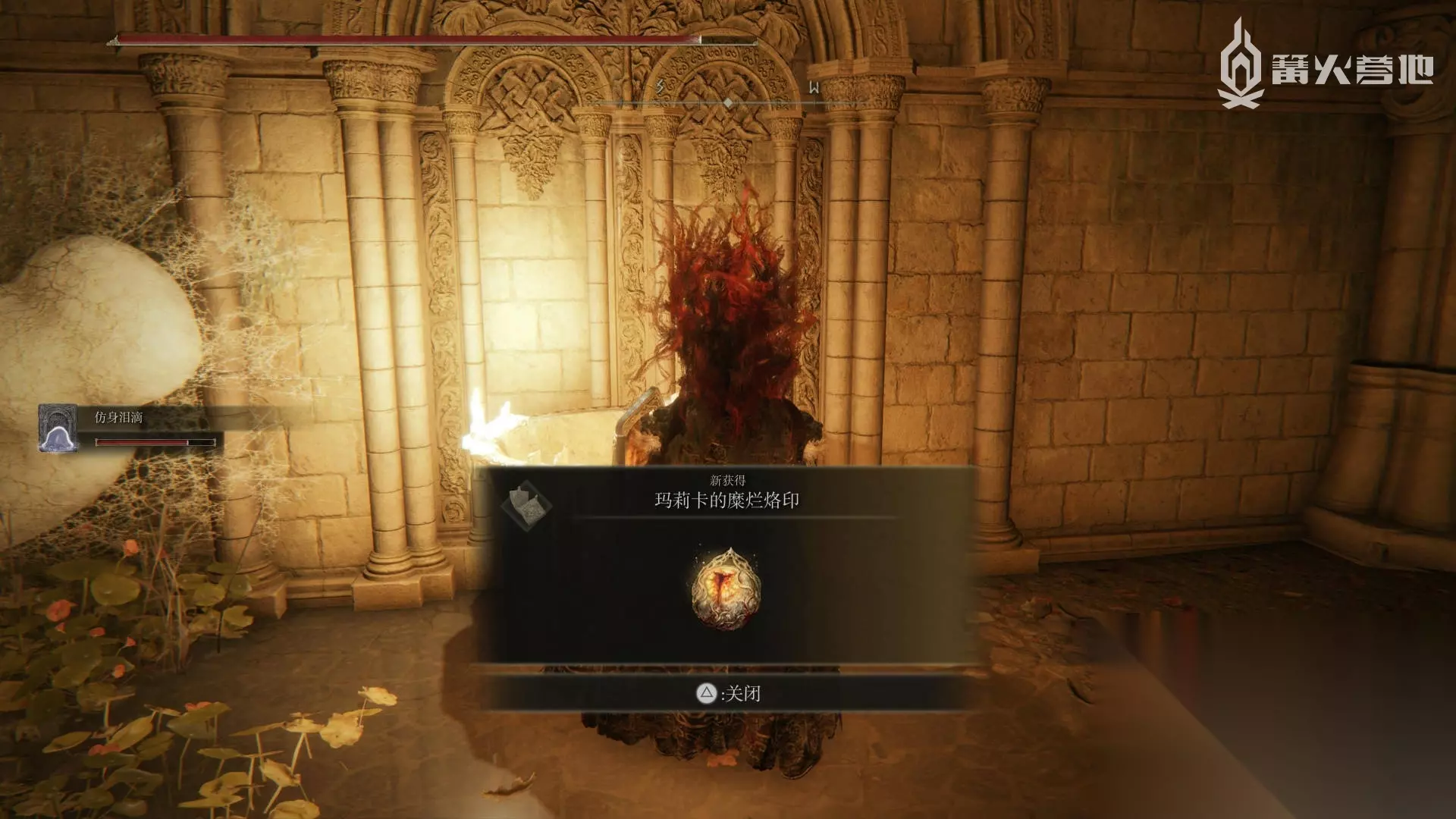 玛莉卡的糜烂烙印 需要前往化圣雪原,在圣树的赐福「祈祷室」出发,通过右侧的平台跳到向下延伸的柱子上,然后通过有小黄金树的化身的廊桥跳到最下面的地面(有数个接肢怪),打开靠近祈祷室处需要用石剑钥匙开启的雾门,在其中可以获得此护符。