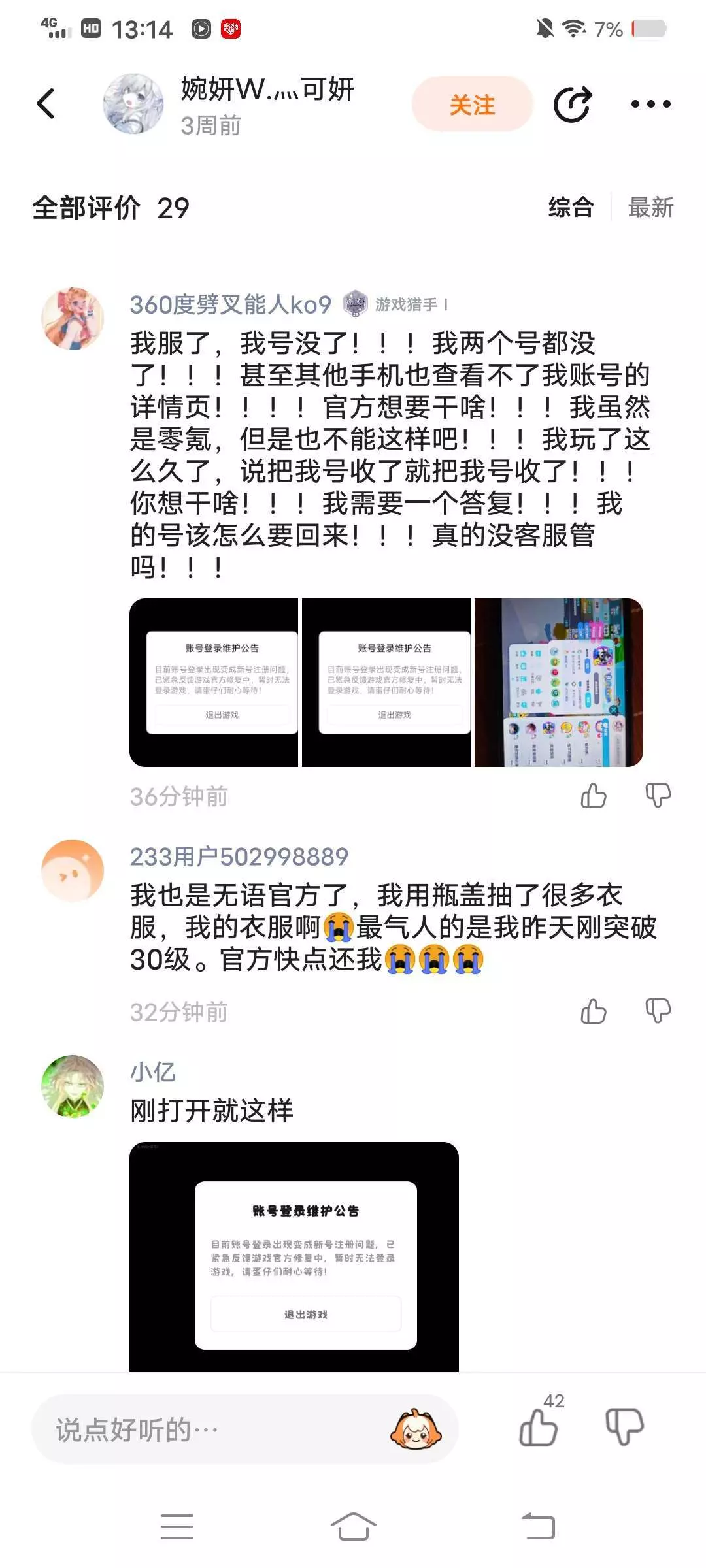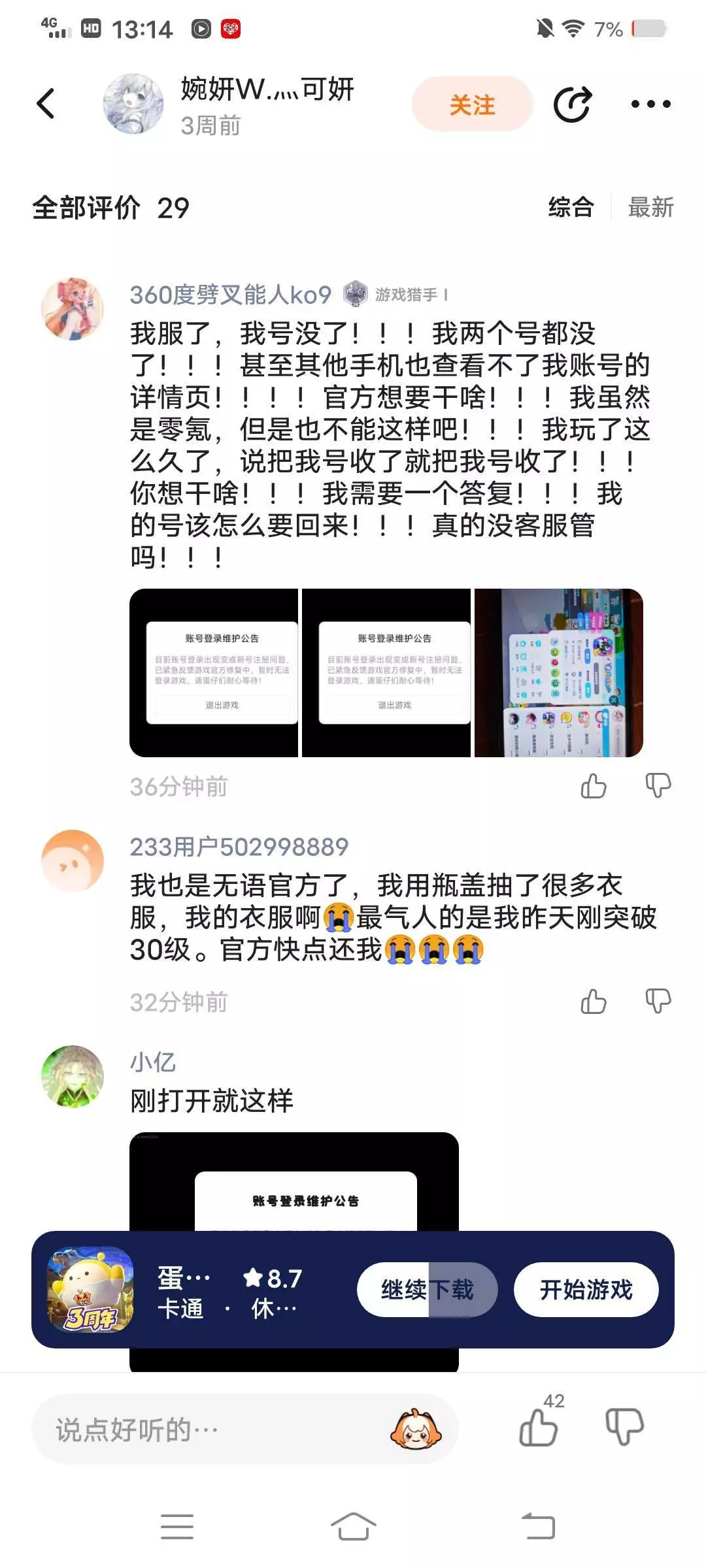 玩儿了这么久的蛋仔派对,今天一进入游戏也收到了这个公告登不上号,有很多人都评论说号没了,怎么办?我还没更新完,现在给我整的不知如何是好了:(
