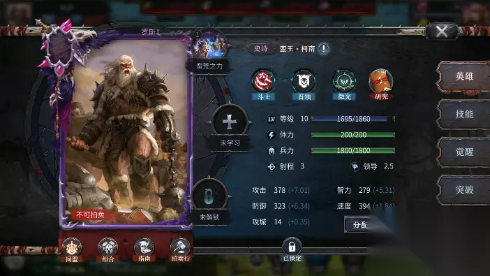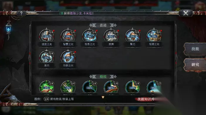 3、英雄技能 开局后会有一点古代纸张,做任务也会送,一些建筑也会生产,这里可以等古代纸张凑到2000时候去普通仪式卡包连续招募20次,连续20次招募比较容易获得高阶卡,把获得的绿色和白色英雄,可以转化为技能,绿色的要三张卡才能研究出一个技能,白色的只要一张就行,因为前面资源有限,所以蓝色武将和紫色紫将比较珍贵,而且研究所需的卡牌数量也比较高,所以一般前期千万不要弄蓝色和紫色的技能,十分的拖节奏