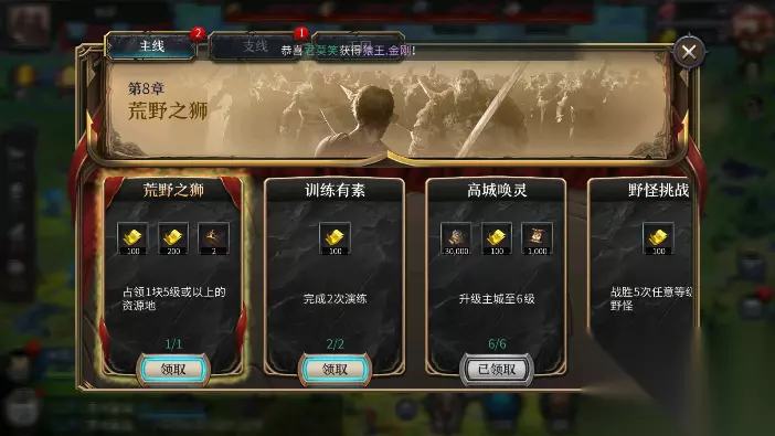 打地一般是前排损兵多,兵越多输出越高 所以阵型上我们把蛮王放在首领位,龙船劫掠者中阵,王城守卫/蛮族谋士先锋位 那么初次的出征其实不难,难的则是要把握住什么样的地该打,什么样的地不该打。通过教程任务,打完一级地之后,应该就可以直接打二级地了,除铺路以外,就不要再打一级地了。打高级地的时候,如果打平了,就派二号部队去就行。 这里建议第一次玩,优先跟着任务序列走,任务栏就在聊天框的正上方。憋发育升主城看起来发育最快,但中间因为没有领取资源和远古纸张,可能会卡时间,在不熟悉游戏过程的时候,少动脑筋跟着设计师走就是最好的办法