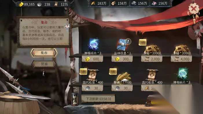 洪荒文明这里设计的很人性化,跟着点就行,领取的古代纸张和资源足够你前期开荒发育了。另外游戏里做任务还会给力量符纸奖励,除了可以抽英雄之外不要忘记经常去内政栏里的游商看一下,经常会有大量的打折资源,前期在兵力充足的时候,多余的粮食也可以适当在市场换成石头加快自己的发育