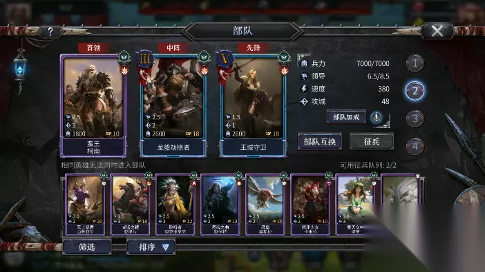 等级:越高属性越强,后面是升级所需经验条 体力:上限200,类似疲劳值,组队行动的武将一起行动会消耗固定数额的体力值,体力值会随着时间自动补充 攻击:武将每次物理攻击的基础值,该数值越高武将单体攻击越疼 防御:决定武将的防御力,该数值越高武将越抗揍 智力:提升部分武将的武将技和魔抗,智力值越高技能打人越疼,同时魔抗越高 速度:可以增强部队的移动速度,并且在战斗中可以更早出手 攻城:数值越高,敌方方建筑耐久度掉的越多 关于攻城 攻城会在一定时间陆续扣除建筑物耐久值,打到零即可占领 2、组队出征 首次出征,系统会送一张蓝卡【王城守卫】,完成征讨蛮族任务后,游戏赠送一张紫卡【蛮王柯南】,如果首冲会送一张紫卡【艾莎】,我们的配置就是系统赠送的【蛮王】+【龙船劫掠者】+【王城守卫】/【蛮族谋士】