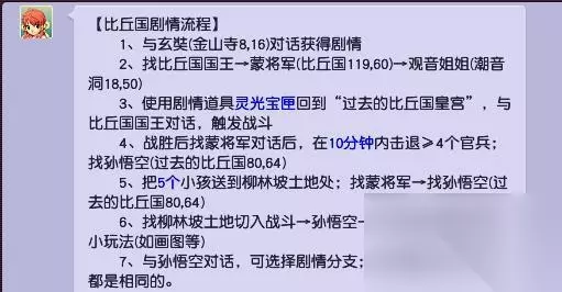 2.流程如下: 1)与玄奘(金山寺8,16)对话获得剧情 2)找比丘国国王→蒙将军(比丘国119,60)→观音姐姐(潮音洞18,50) 3)使用剧情道具灵光宝匣回到“过去的比丘国皇宫”,与比丘国国王对话,触发战斗 4)战胜后找蒙将军对话后,在10分钟内击退≥4个官兵;找孙悟空(过去的比丘国80,64) 5)把5个小孩送到柳林坡土地处;找蒙将军→找孙悟空(过去的比丘国80,64) 6)找柳林坡土地切入战斗→孙悟空→幻化成其他模样进行小玩法(如画图等) 7)与孙悟空对话,可选择剧情分支;分支奖励、战斗难度都是相同的。