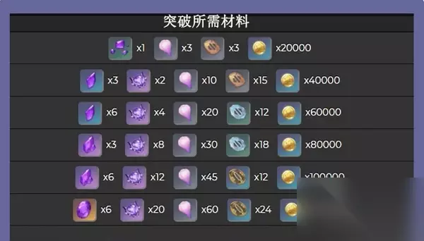 雷电将军等级突破: 1、20级突破,:20000摩拉、最胜紫晶碎屑1个、天云草实3个、破旧的刀镡3个。 2、40级突破:40000摩拉、最胜紫晶断片3、雷霆数珠2个、天云草实10个、破旧的刀镡15个。 3、50级突破:60000摩拉、最胜紫晶断片6、雷霆数珠4个、天云草实20个、影打刀镡12个。 4, 60级突破:80000摩拉、最胜紫晶块3个、雷霆数珠8个、天云草实30个、影打刀镡18个。 5、70级突破:100000摩拉、最胜紫晶块6个、雷霆数珠12个、天云草实45个、名刀镡12个。 6、80级突破:120000摩拉、最胜紫晶6个、雷霆数珠20个、天云草实60个、名刀镡24个 升级花费汇总:大英雄经验*418、摩拉*2092530